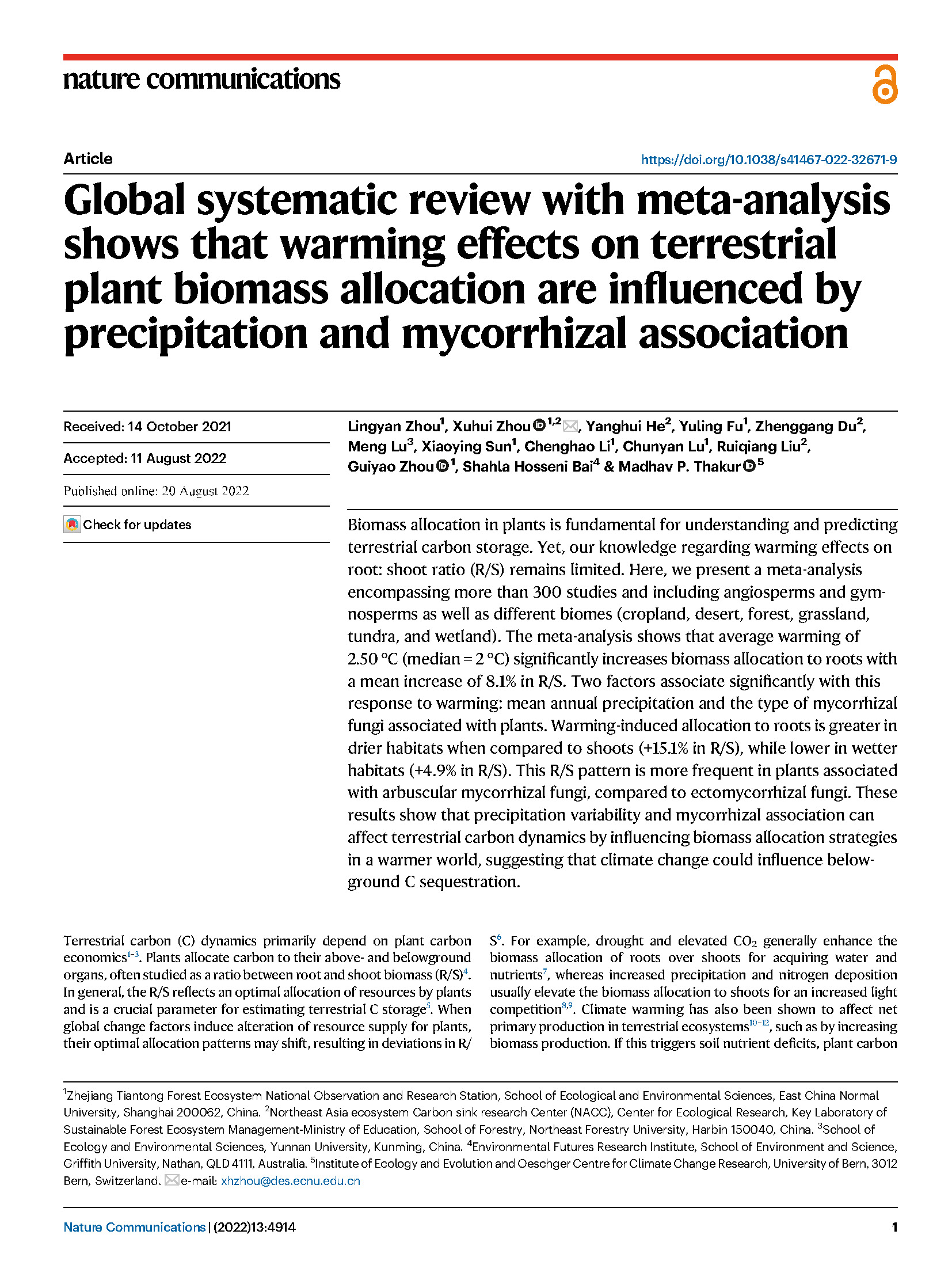 近日,华东师大全球变化生态学研究团队在植物地上-地下生物量响应增温方面取得最新进展,研究成果 Global systematic review with meta-analysis shows that warming effects on terrestrial plant biomass allocation are influenced by precipitation and mycorrhizal association 于2022年8月20日在 Nature Communications 上在线发表(https://doi.org/10.1038/s41467-022-32671-9)。