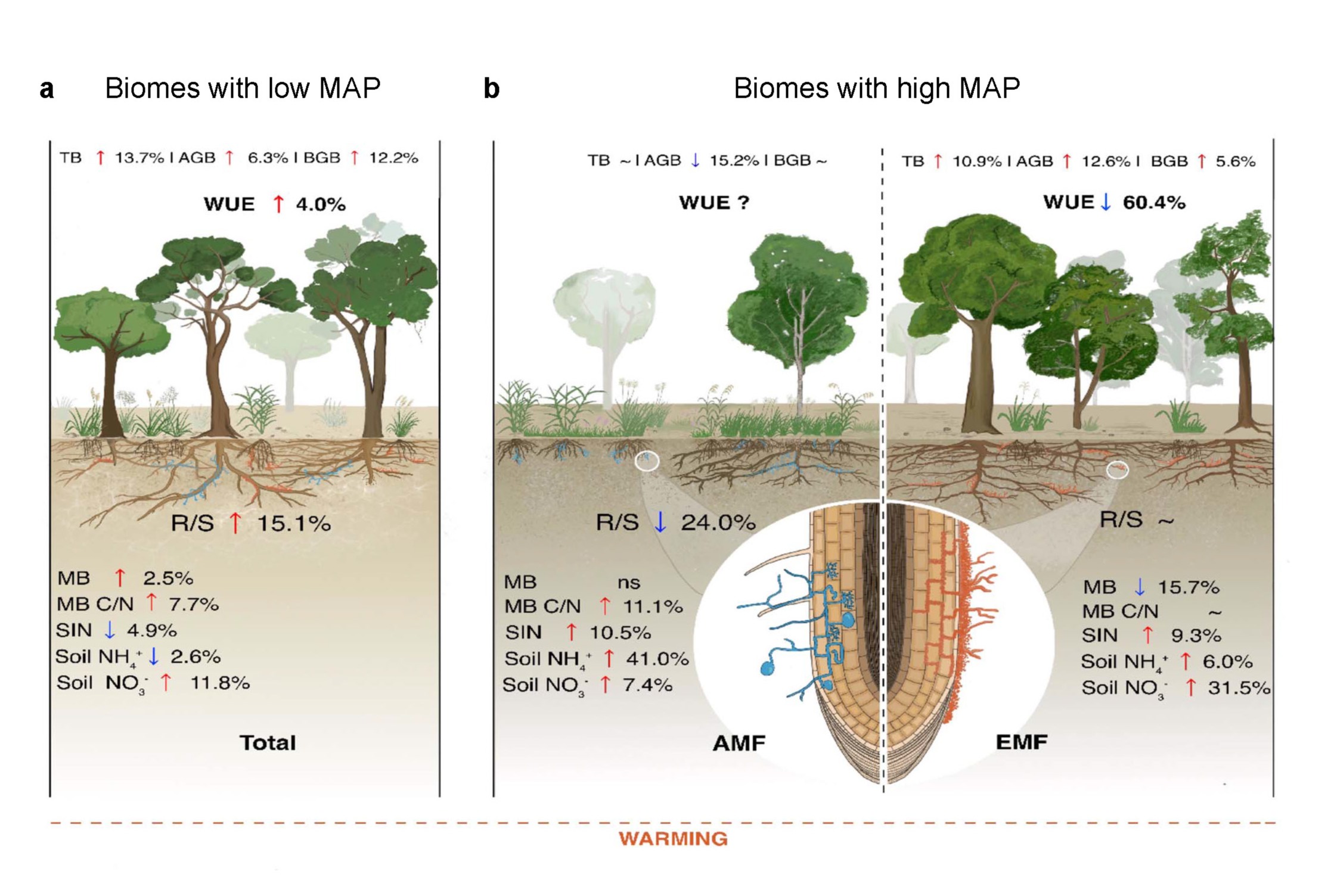 研究发现,全球平均2.5°C(中值=2 °C)的增温将显著增加地下生物量分配(R/S平均增加8.1%)。其中,区域降雨水平与植物的菌根类型是调控植物R/S响应增温的两大重要因素。在相对干旱的环境下,增温引发更多生物量向根系分配(R/S增加15.1%),而在湿润生境中增温对植物R/S的影响相对较低(平均增加4.9%)。不同菌根真菌与植物根系在长期进化中所形成的共生关系影响植物生物量分配对增温的响应。相对外生菌根类型的植物,植物根冠比对增温的这种响应模式在丛枝菌根真菌植物中更为常见。该研究揭示了菌根真菌对植物响应增温的重要调控作用,指出在未来气候变暖过程中,区域降雨水平与植物菌根类型将通过调控生态系统地上-地下生物量的分配影响陆地碳动态,改变生态系统地下碳固存。