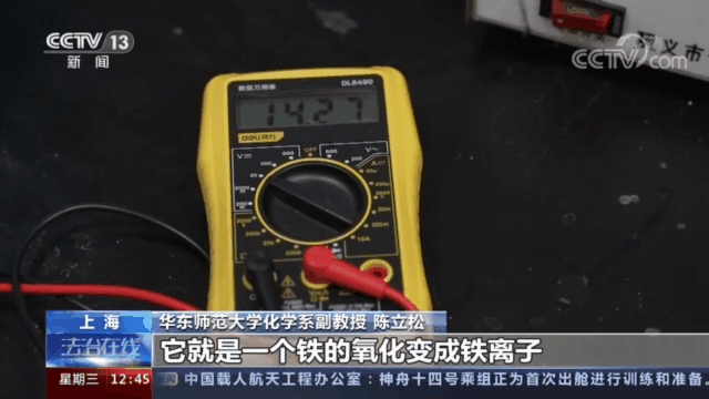 陈立松副教授表示,这种物质就是一个铁的氧化变成铁离子,同时产生氢气的这样一台机器,就是与我们常见的电解水是没有任何的区别的,只是一个阳极变成了一个铁片,铁的一个线圈。