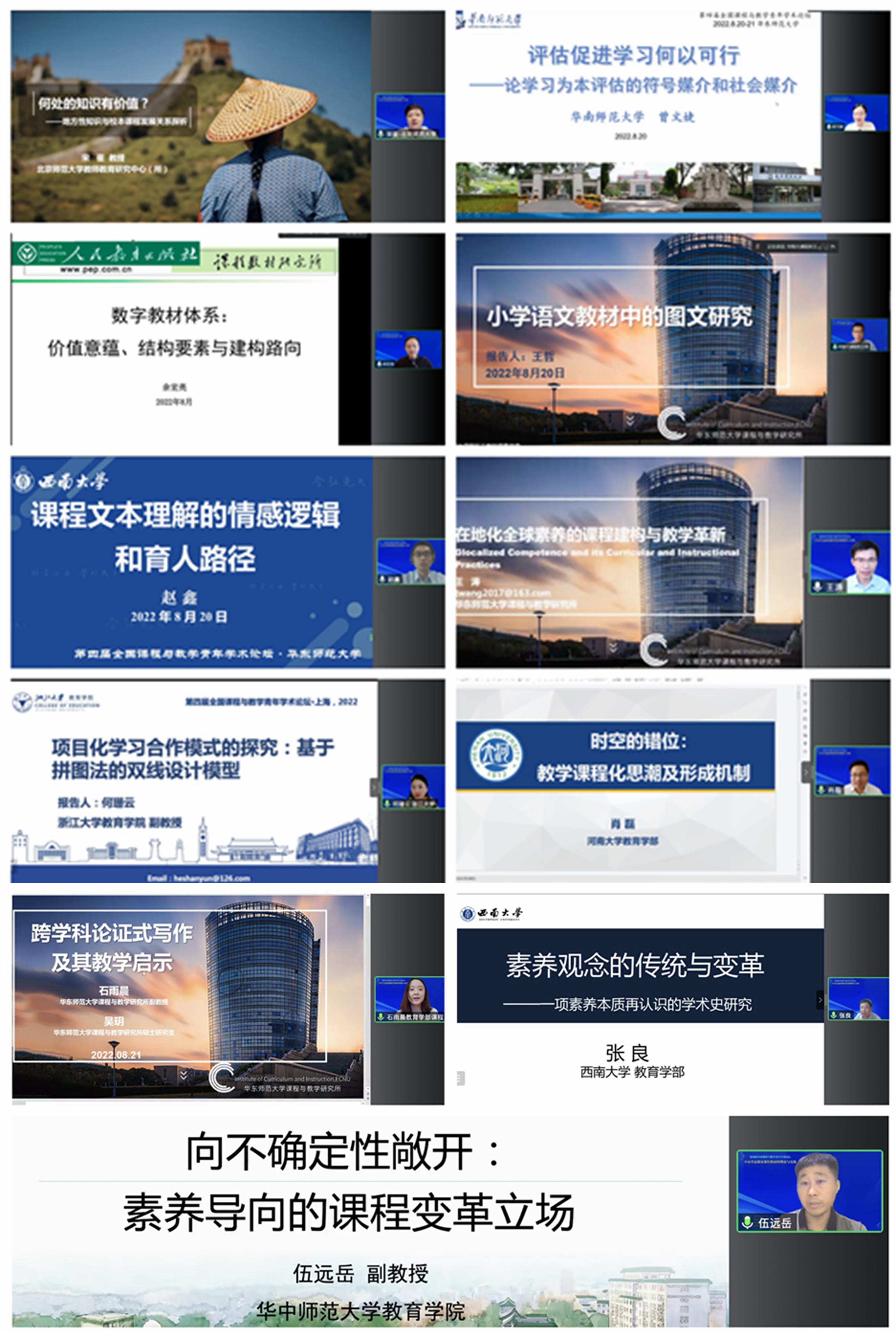 为推动中小学高质量课程教材的新发展,助力全国中小学高质量课程教材的理论创新和学术引领,8月20-21日,在全国课程学术委员会指导下,教育部人文社科重点研究基地华东师大课程与教学研究所主办了以“中小学高质量课程教材的理论与实践”为主题的第四届全国课程与教学青年学术论坛,论坛特邀全国60多位青年学者分享真知灼见,并邀请10多位资深专家作大会主旨报告和点评,为推进新时代中小学高质量课程教材建设提供集体智慧与洞见。论坛以线上会议的形式举行。