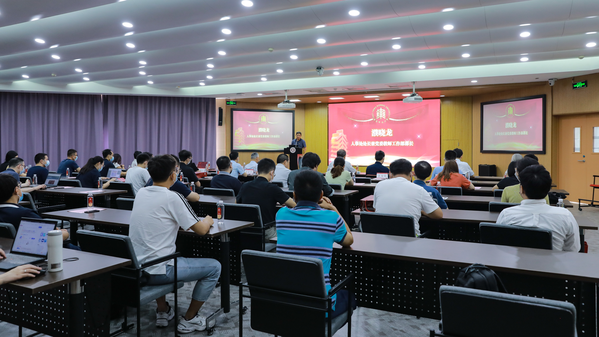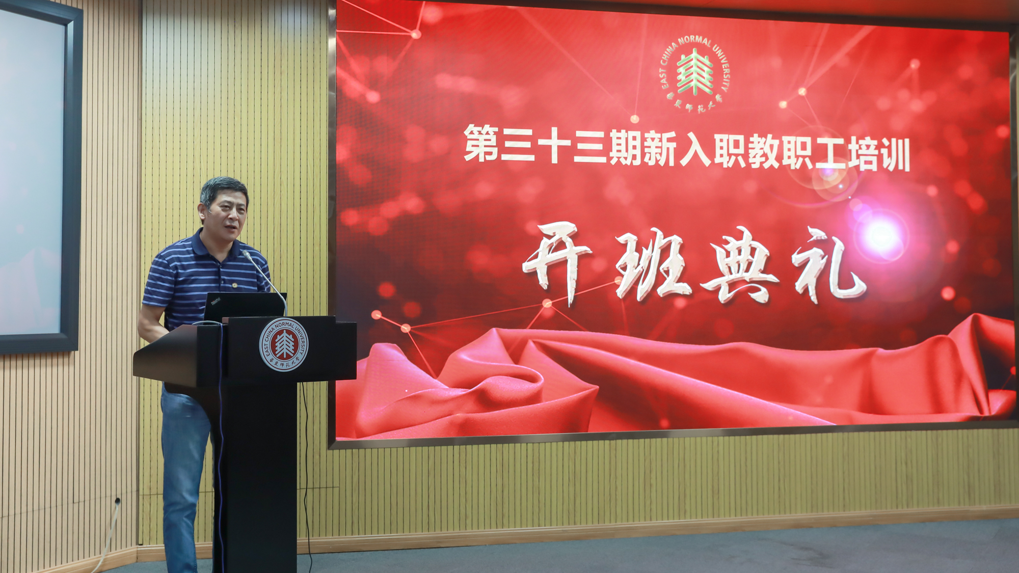 华东师大第33期新入职教职工培训开班典礼于8月29日在普陀校区图书馆二楼报告厅举行。校党委副书记朱民,“创获智慧”中国哲学教学与研究团队(全国高校黄大年式教师团队)负责人杨国荣,教务处处长孟钟捷,研究生院常务副院长吴健,教师发展学院党总支书记赵健,机关党委副书记张军,人事处处长兼党委教师工作部部长濮晓龙,党委教师工作部常务副部长卢波、副部长方金奇及全体参训教职工出席了本次开班典礼。按照疫情防控相关规定,本次开班采用线下和云端直播同步的方式进行。典礼由人事处处长兼党委教师工作部部长濮晓龙主持。