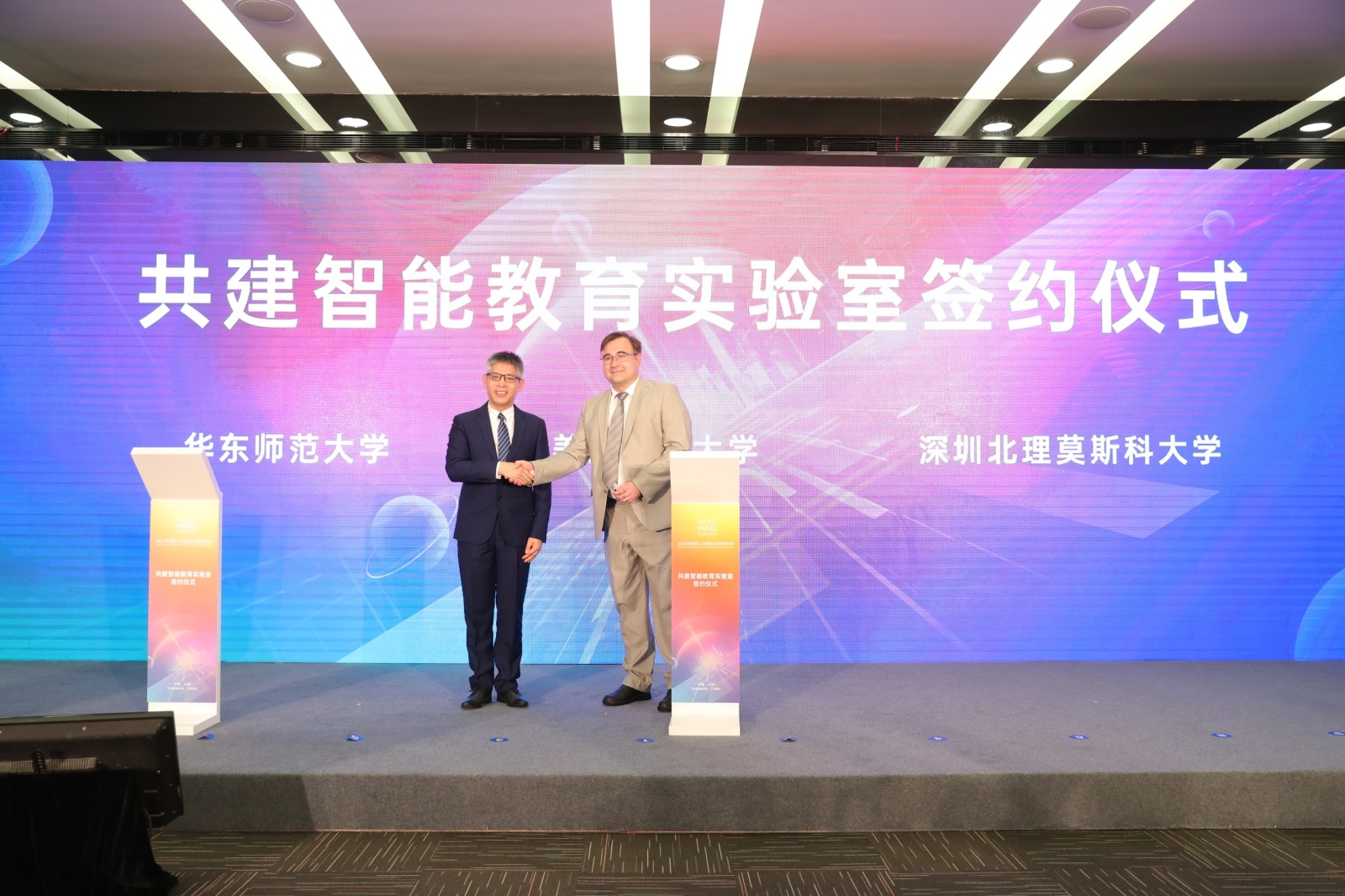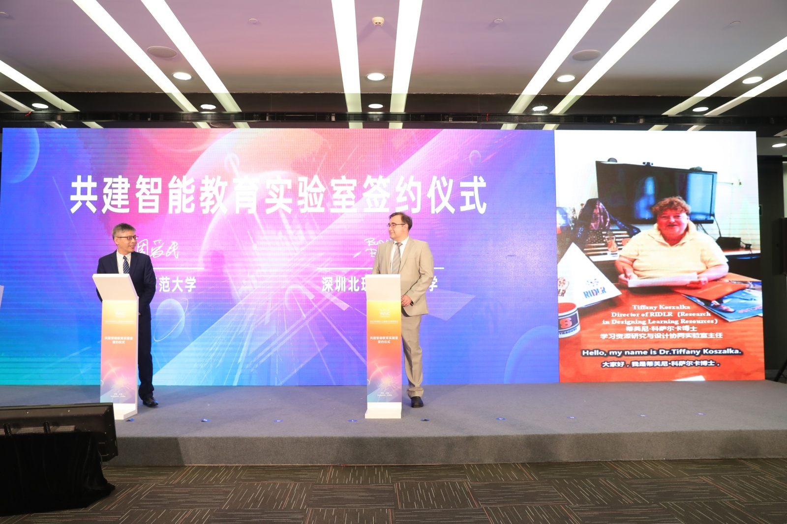 在共建智能教育实验室签约仪式上,由俄罗斯莫斯科大学教授、深圳北理莫斯科大学教授布达克先生,beat365正版唯一官网智能教育实验室副主任周爱民先生上台,同时携手美国雪城大学学习资源研究与设计协同实验室主任科萨尔卡女士在线通讯,共同完成签约仪式。这标志着智能教育发展的国际合作平台进一步拓展。