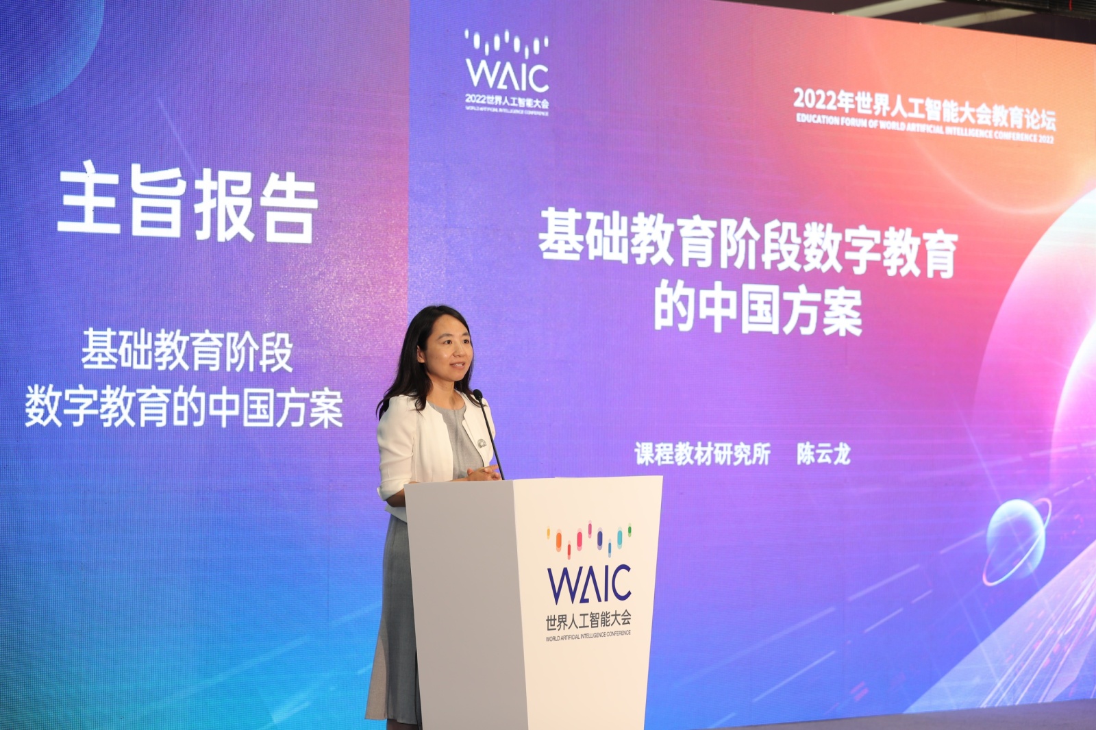 在人工智能课程标准与读本研制成果发布环节,上海人工智能实验室智能教育中心主任戴娟首先介绍了实验室及与华东师大联合开展的项目工作。随后,课程教材研究所课程改革实验研究中心魏娜以《基础教育阶段数字教育的中国方案》为题作了分享。她提出,中国高度重视基础教育阶段数字教育。当前面对数字教育发展现状,上线国家智慧教育平台,构建国家、省、市、县、学校五级智慧教育体系,开展实验研究,明确实施路径,不断积累数字教育实践经验。未来应对数字教育新形势、新挑战,坚持以政策为引领,聚焦关键问题,深入开展实践探索,全面推进教育数字化转型,形成基础教育阶段数字教育的中国方案。