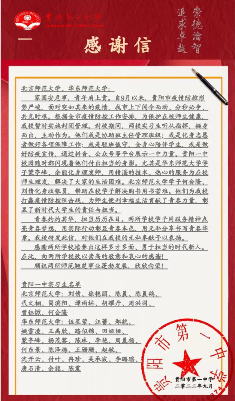这次感谢信由贵阳一中党委书记、校长陈章义提议发出,他有感于华东师大学子的担当与付出,特嘱咐发信感谢。贵阳一中作为贵州省第一所一类示范性高中,至今已有百余年办学历史。学校倡导“美好教育”办学理念,以“美”的信念统筹学校教育教学工作。