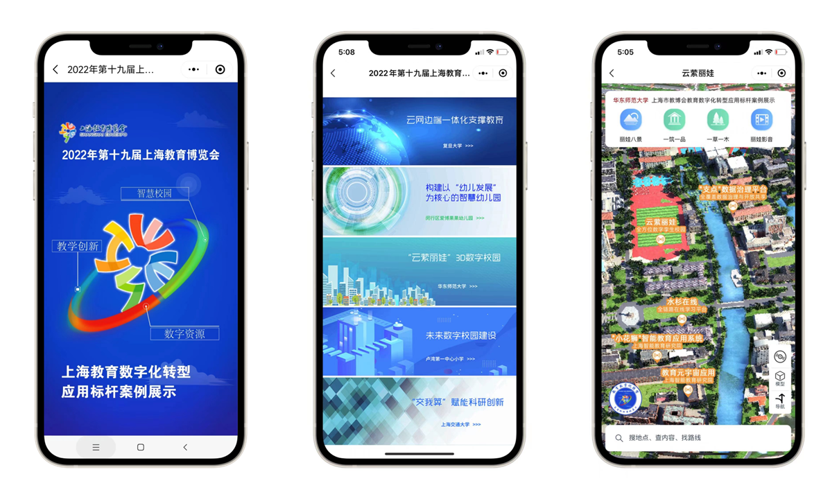 在展会“云体验”板块,设立了“上海教育数字化转型应用标杆案例展示”,华东师大信息化成果入选代表性案例。通过“上海教育博览会”小程序的“云体验”的“教育应用场景”通道,可进入“上海教育数字化转型应用标杆案例展示”,在“智慧校园”板块可线上体验华东师大案例。