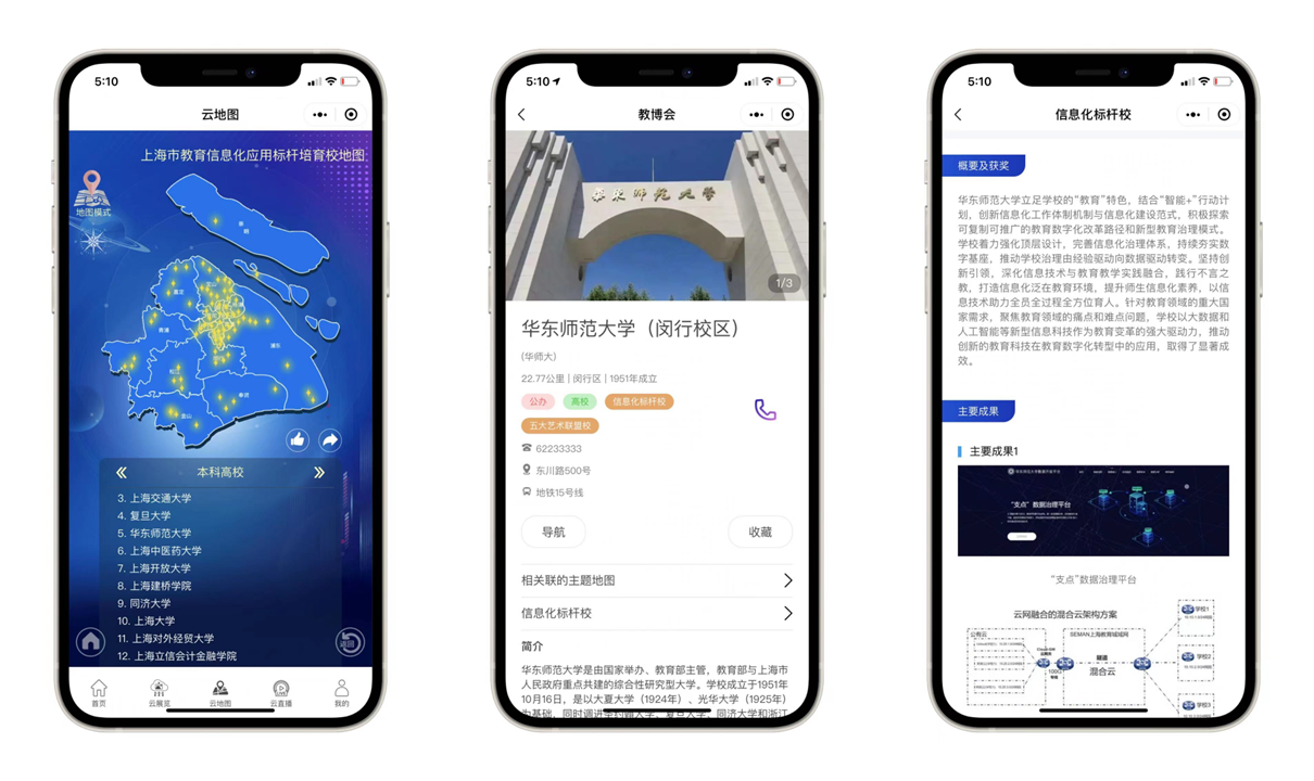 此外,华东师大2019年入选了第一批上海市教育信息化应用标杆培育校。在“云地图”的“教育数字化转型地图”中,可查看包括我校在内的上海市教育信息化应用标杆培育校的建设成果。