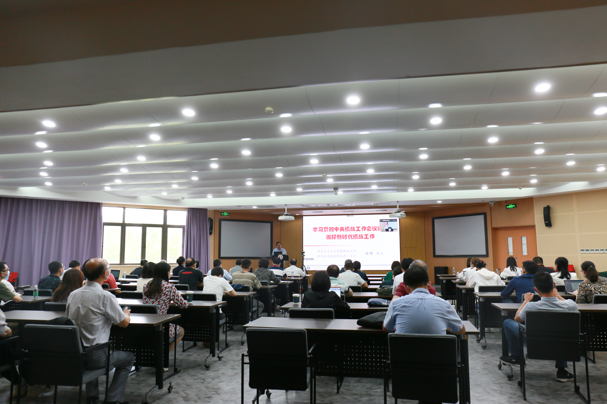 9月29日下午,学习中央统战工作会议精神辅导报告会在普陀校区图书馆二楼报告厅举行,上海市社会主义学院教研部主任、新型政党制度研究中心主任刘晖教授作辅导报告。学校党委统一战线工作领导小组成员单位分管负责同志,院系级党组织统战工作分管领导、联络员,各民主党派、统战团体领导班子、委员会委员及支委骨干成员,近三年新加入民主党派、统战团体以及认定为无党派人士的成员等参与了本次学习,本次会议以线上线下结合的形式举行,线下40余人,线上80余人参会。辅导报告会由党委常委、统战部部长兼机关党委书记王庆华主持。