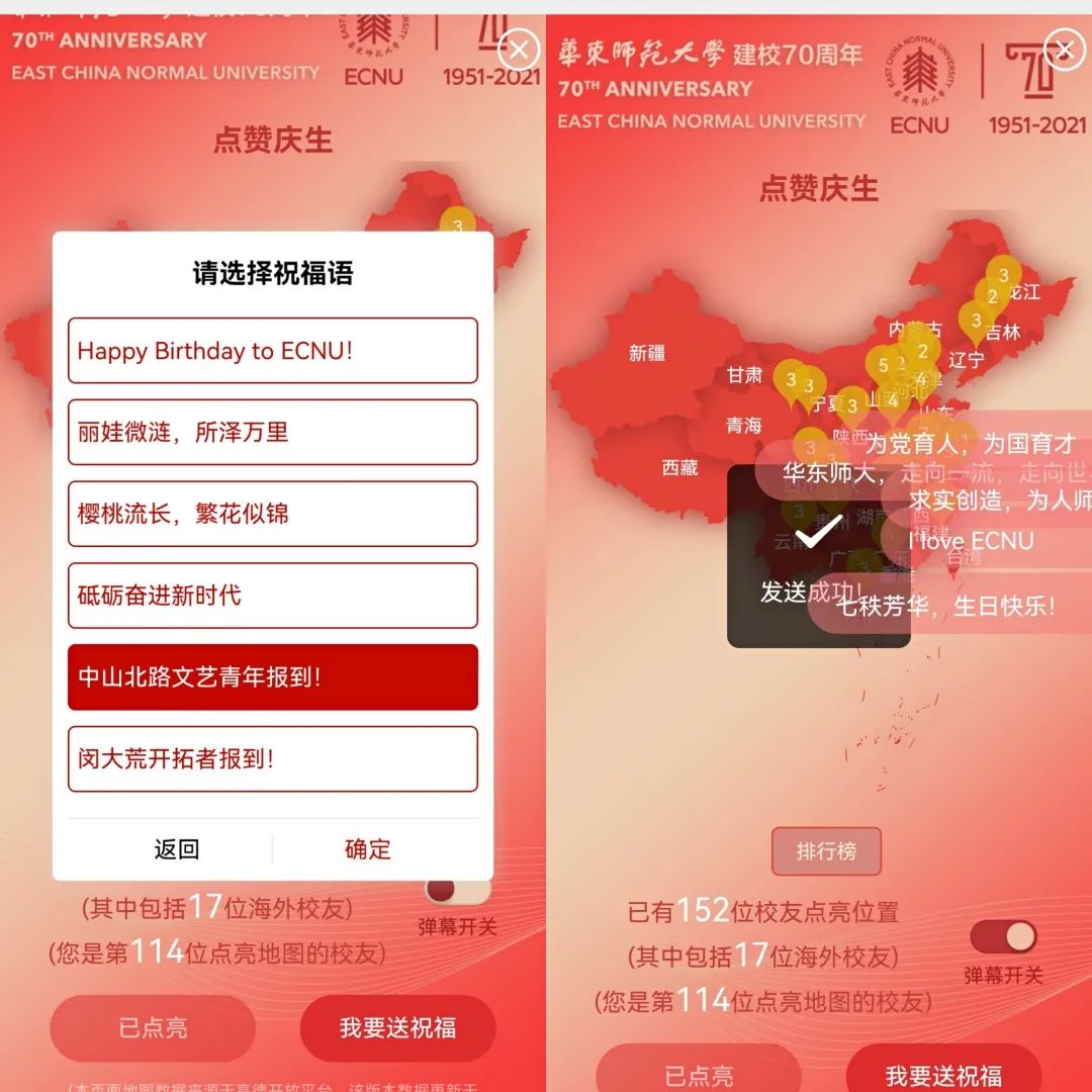 全球57个国家和地区的86个城市校友自发组织开展“旗传四海”活动。校友企业分众传媒在全国76个城市36万块屏幕共同庆祝beat365正版唯一官网生日快乐。10月15-17日晚,上海、武汉、杭州、广州、合肥、南昌6个城市地标建筑接续点亮“师大红”,助力各地校友就近参与共庆母校七秩芳华。