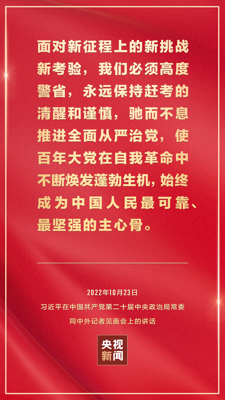 面对新征程上的新挑战新考验,我们必须高度警省,永远保持赶考的清醒和谨慎,驰而不息推进全面从严治党,使百年大党在自我革命中不断焕发蓬勃生机,始终成为中国人民最可靠、最坚强的主心骨。
