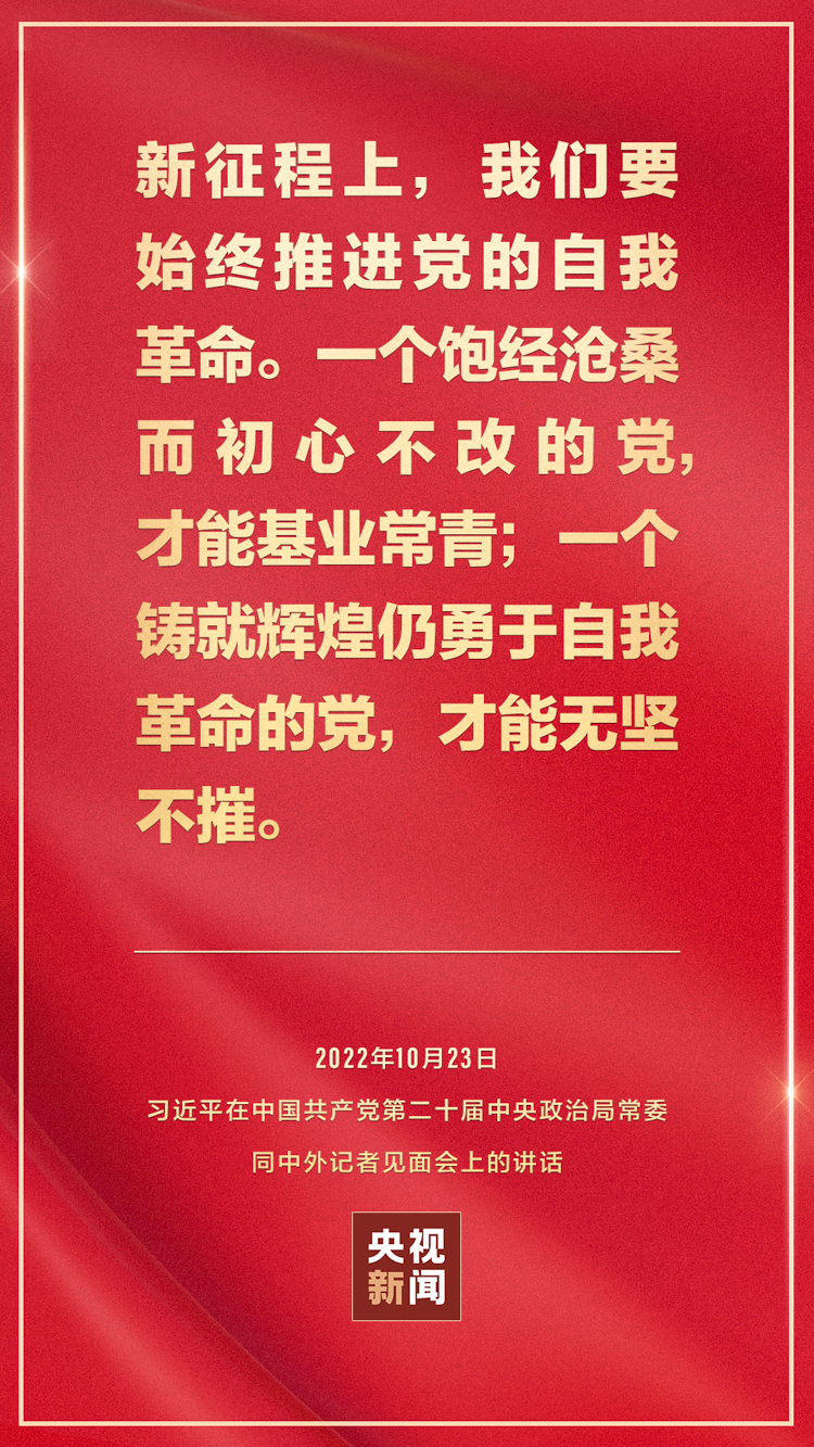——新征程上,我们要始终推进党的自我革命。一个饱经沧桑而初心不改的党,才能基业常青;一个铸就辉煌仍勇于自我革命的党,才能无坚不摧。百年栉风沐雨、淬火成钢,特别是新时代10年革命性锻造,中国共产党更加坚强有力、更加充满活力。