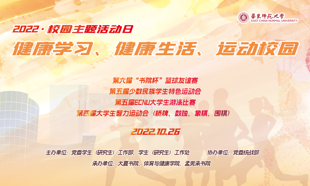 “书院杯”篮球友谊赛决赛、少数民族学生运动会、ECNU大学生游泳比赛、大学生智力运动会(桥牌、数独、象棋、围棋)比赛等丰富活动,非常期待哦!