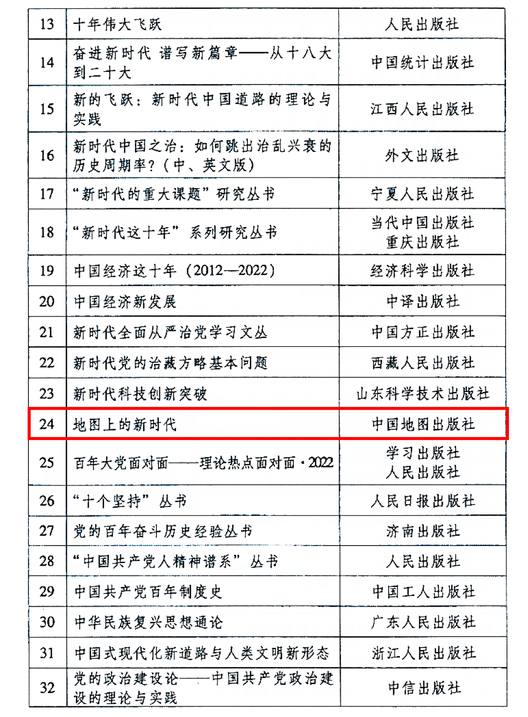 华东师大地理科学学院党委书记段玉山教授主编的校四史教育成果《地图上的新时代》获“中央宣传部2022年主题出版重点出版物”选题,本次选题以突出迎接宣传贯彻党的二十大工作主线,充分发挥重点出版物的引领示范作用,在全社会形成唱响主旋律、传递正能量、提振精气神的浓厚文化氛围。