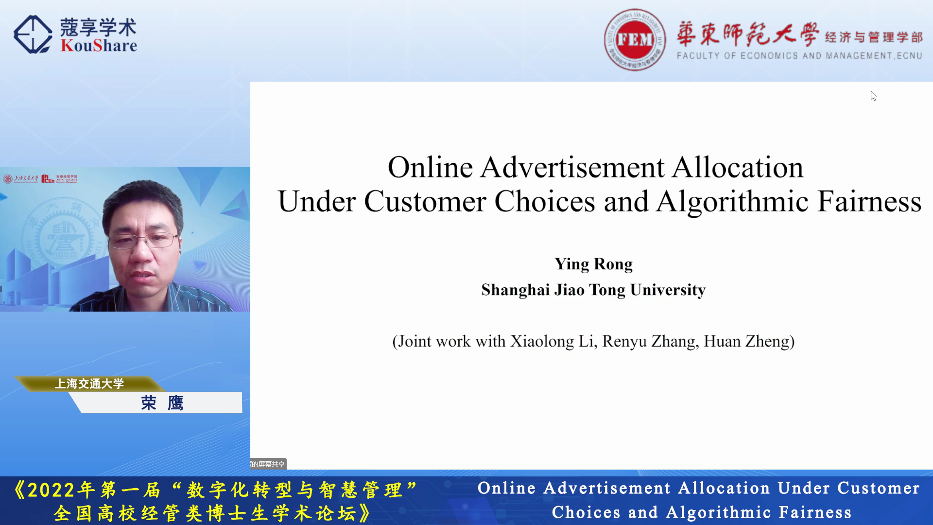 10月23日上午,在大会特邀报告环节,上海交通大学荣鹰教授以“Online Advertisement Allocation Under Customer Choices and Algorithmic Fairness”为题,探讨了当客户按照选择模式点击广告时,电子商务平台在每个客户到达时的有限时段的动态广告分配。荣鹰教授提出了一个新颖的随机程序框架,该模型和算法有助于大幅提高在线电子商务平台的广告分配的公平性,而不影响其效率。