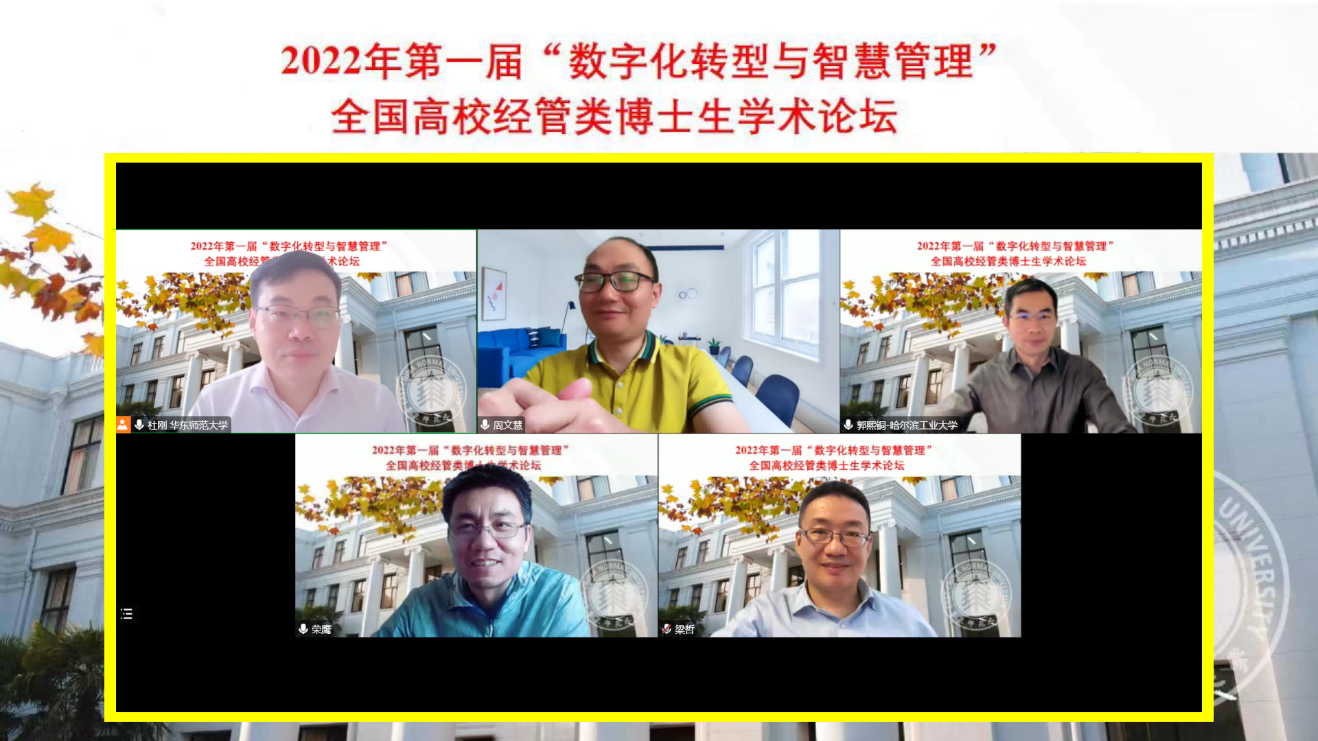 10月22-23日,由华东师大研究生院主办,华东师大经济与管理学部、工商管理学院、统计交叉科学研究院和《系统管理学报》编辑部联合承办的2022年首届“数字化转型与智慧管理”全国高校经管类博士生学术论坛在线举行。论坛由经管学部统计交叉科学研究院副院长、中国运筹学会医疗运作管理分会副理事长杜刚教授发起和策划组织,吸引了来自全国多所院校的累计1.2万余名师生在线观看和研讨。