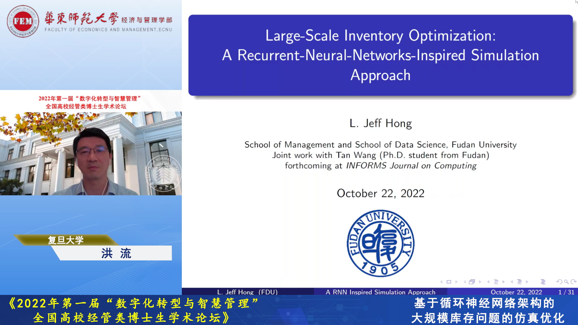 复旦大学洪流教授以“基于循环神经网络架构的大规模库存问题的仿真优化”为题,将循环神经网络架构和库存管理问题结合起来,提出一种高效的仿真优化算法,可以解决具有几十万个节点的大规模库存优化问题。