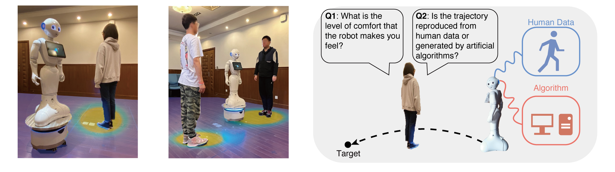 针对第二个问题,研究团队在获取社会行走行为的计算模型后,基于实际工程需求将该模型进行算法化,植入到机器人平台进行验证和优化,检验基于人类智能的算法是否可以提升人类对机器人社会性与拟人性的评价。