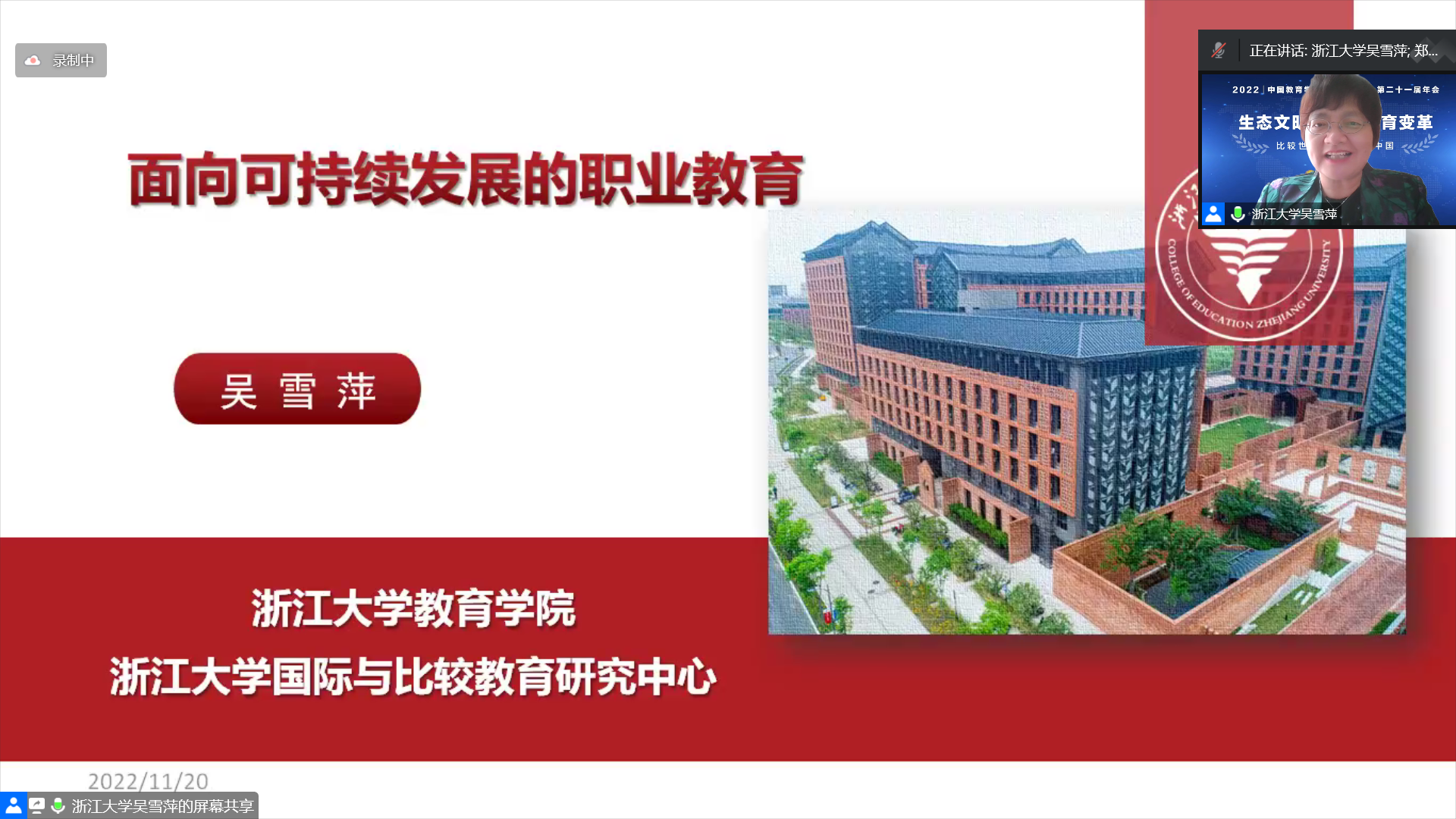 中国教育学会比较教育分会副理事长、浙江大学国际教育研究中心副主任吴雪萍教授作了题为“面向可持续发展的职业教育”的主旨报告,分析了职业教育在可持续发展中的作用,就职业教育如何促进可持续发展提出重要见解,指出面向可持续发展的职业教育有助于实现人与自然的和谐共生。