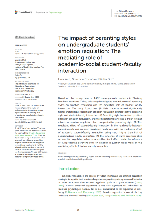 研究论文“The impact of parenting styles on undergraduate students’ emotion regulation: The mediating role of academic-social student-faculty interaction”发表于SSCI来源期刊Frontiers in Psychology。