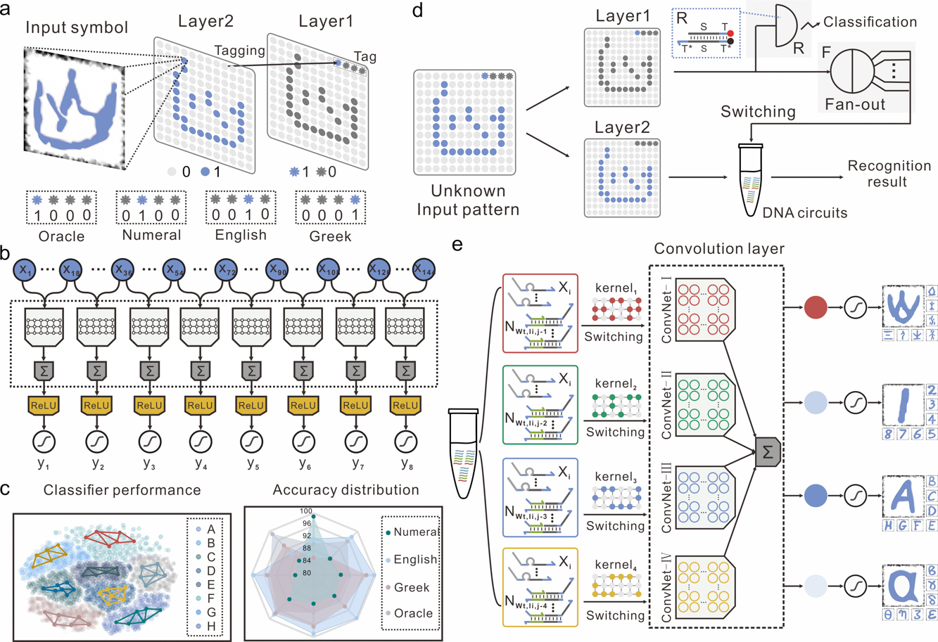 本研究工作首次在试管中使用 DNA 分子实现了卷积人工神经网络的构筑,设计并创建了可执行小型神经元网络功能的模块化生化电路,利用溶液中相互作用的 DNA分子成功展示了类似于脑的功能,通过精准的化学反应级联计算可完成多达32种‘分子笔迹’识别,论证了以 DNA 分子为工程材料去构筑人工分子信息处理系统的巨大潜力。