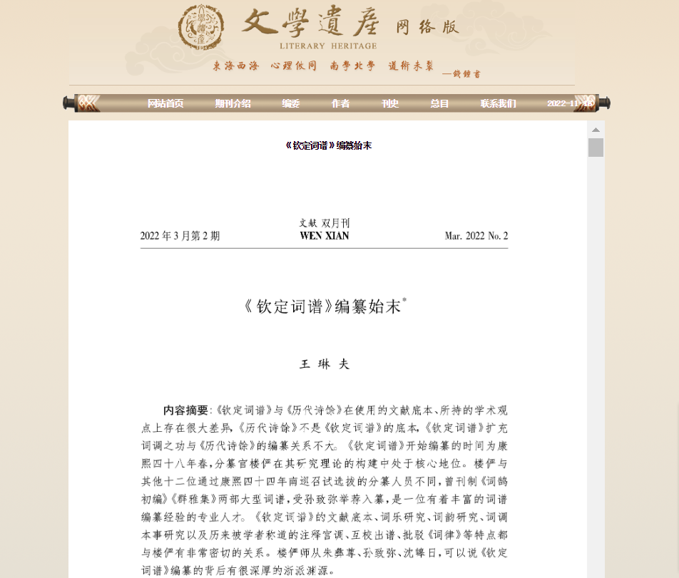 研究论文《〈钦定词谱〉编纂始末》发表于权威B类期刊《文献》,该文在发表后被古代文学研究顶刊《文学遗产》网络版转载。