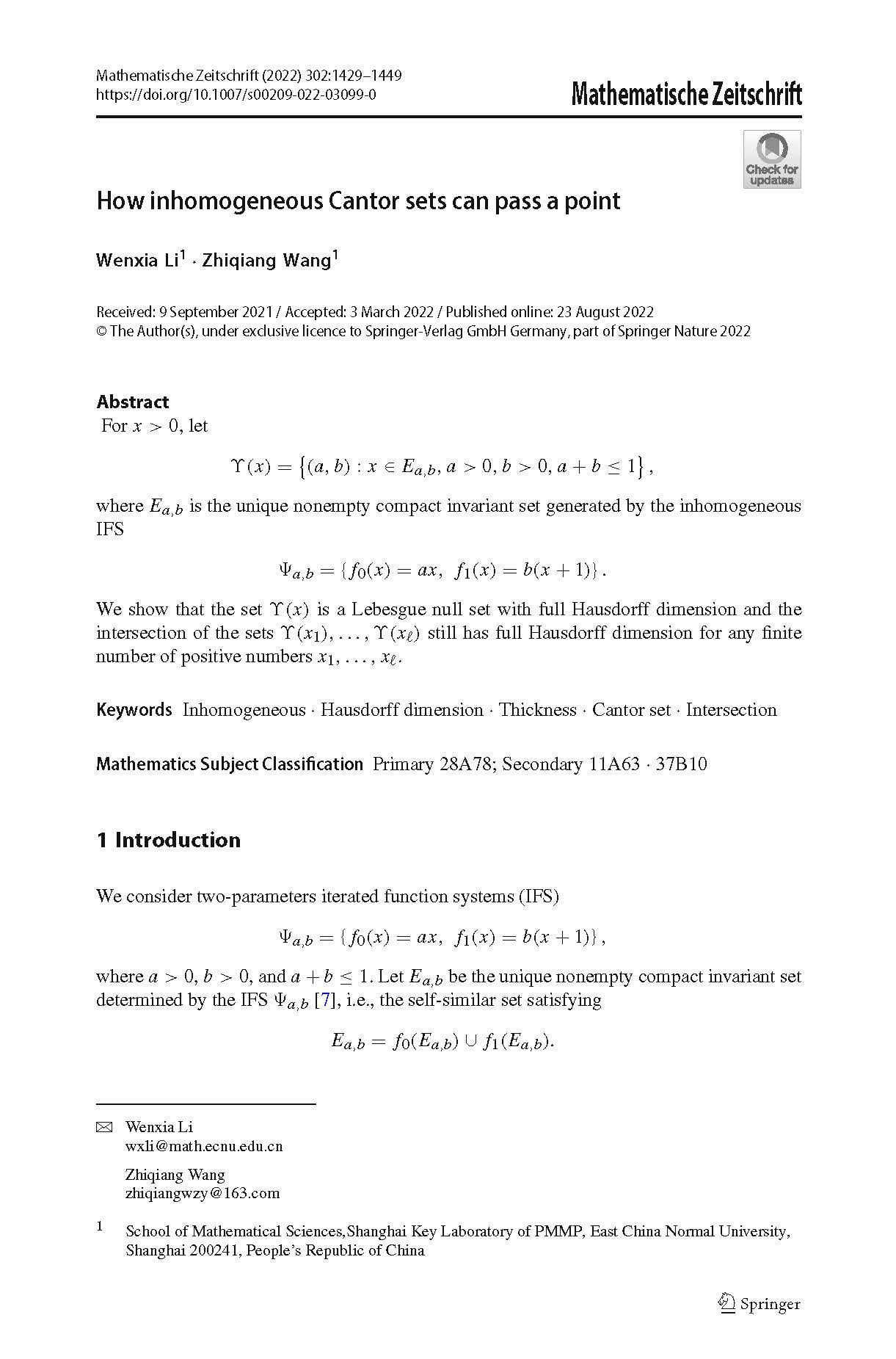 研究论文“How inhomogeneous Cantor sets can pass a point”发表于Mathematische Zeitschrift。论文考虑一族双参数的非齐次迭代函数系统的不变集,证明了一些参数构成的集合是Lebesgue零测集,但具有满的Hausdorff维数,并且有限个集合的交仍然具有满的Hausdorff维数,这些结论还可以得出许多有趣的性质。