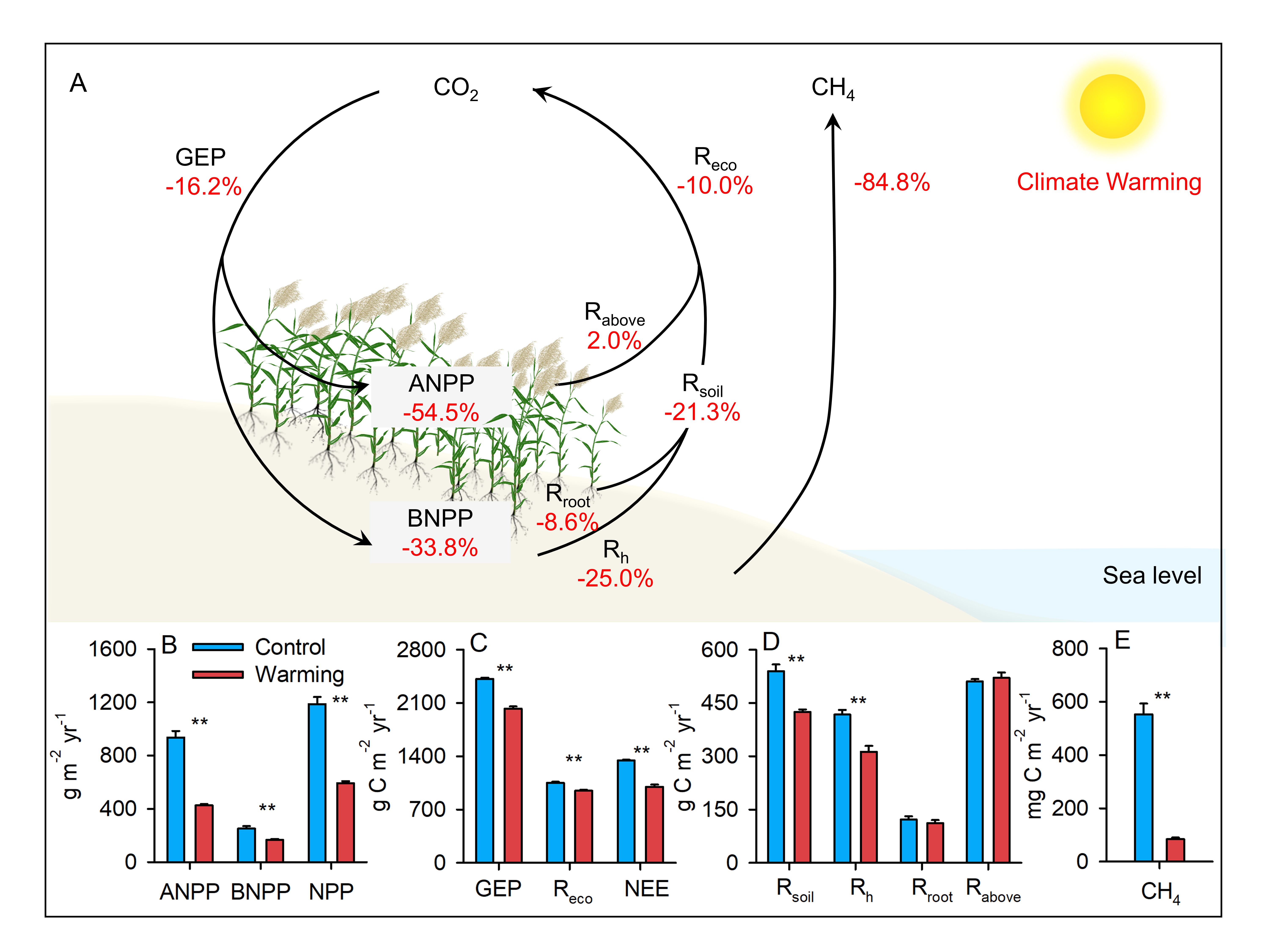 这项研究提供了关于气候变暖降低滨海湿地净生态系统生产力以及改变其季节性的第一个实验证据。这些结果也表明在未来气候变暖的条件下滨海湿地净CO2吸收存在较高的脆弱性。
