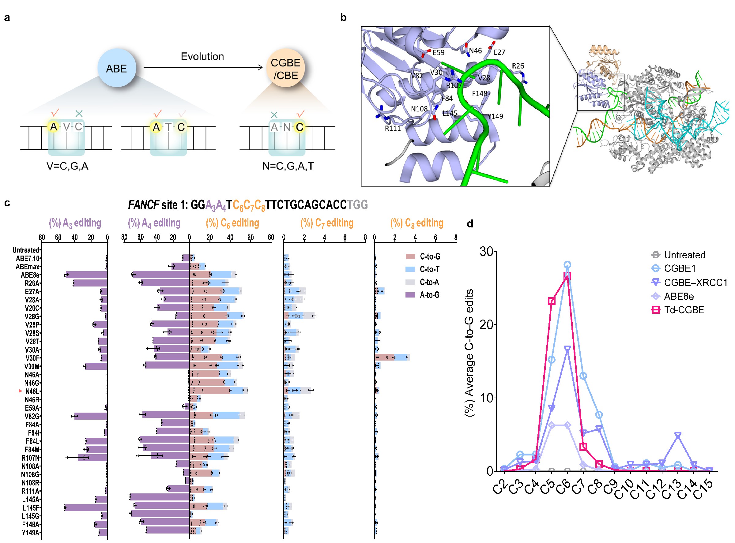 通过对腺嘌呤脱氨酶TadA-8e重新设计,成功改变酶的催化底物种类,构建了第一个不依赖AID/APOBEC天然脱氨酶家族的新型CGBE/CBE系列碱基编辑器(Td-CGBE/Td-CBEs),表现出与传统编辑器相当的编辑效率,而编辑窗口更加精准,脱靶率极低(接近背景水平)。