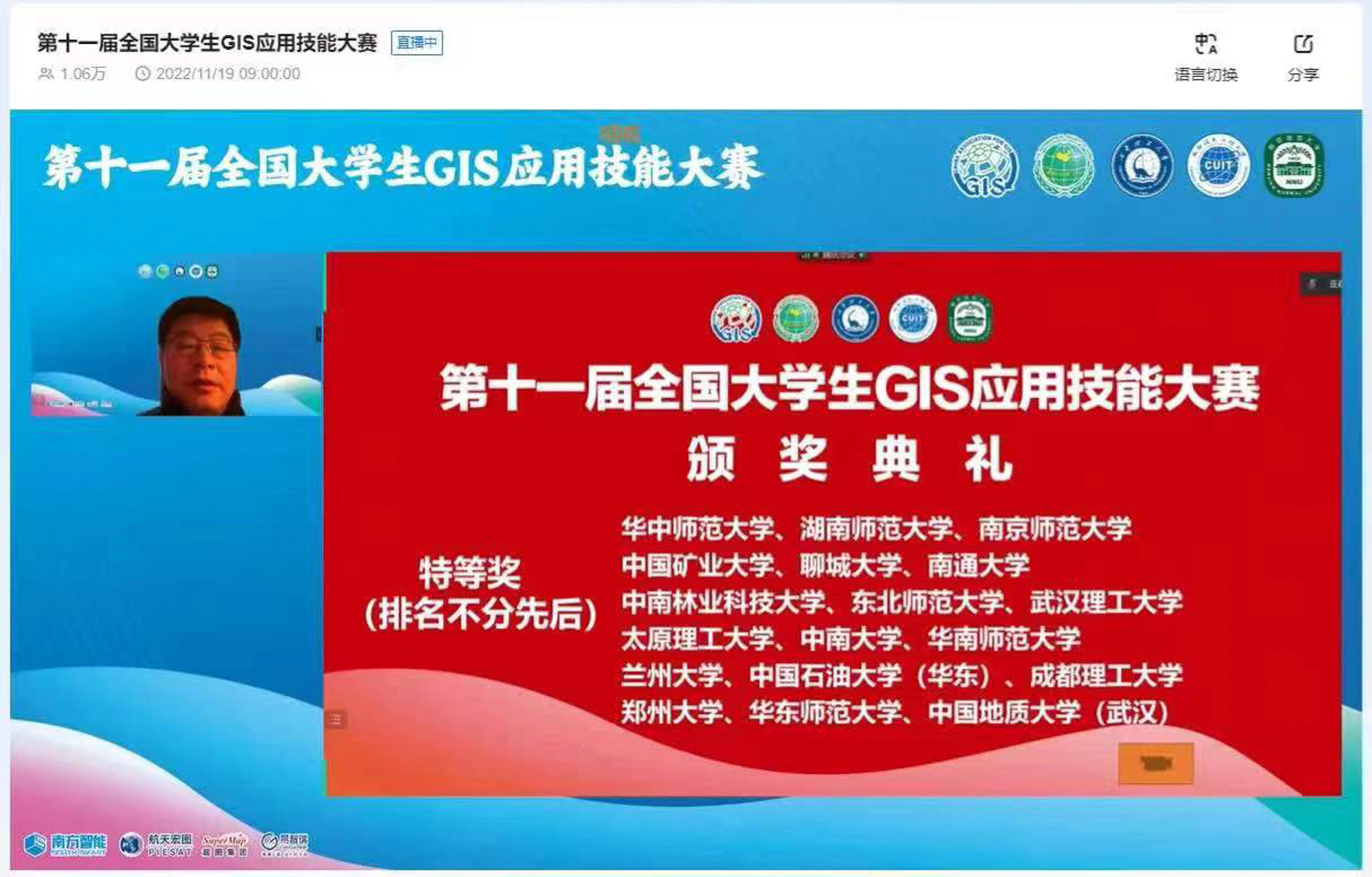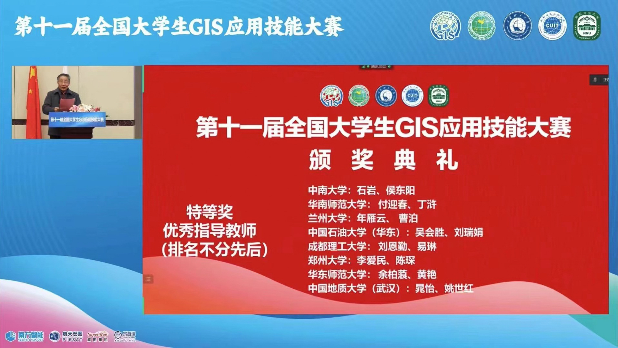 11月18日-20日,由中国地理信息产业协会、中国地理学会主办的“第十一届全国大学生GIS应用技能大赛”在成都理工大学举行,共有来自全国各高校共180支队伍参赛,经过激烈角逐,由beat365正版唯一官网地理科学学院2020级本科生祁宁宁、赵博旸、陈秀静、杨宗翰组成的参赛团队斩获特等奖,余柏蒗、黄艳获优秀指导教师奖,这是beat365正版唯一官网连续第三年斩获全国大学生GIS应用技能大赛特等奖。