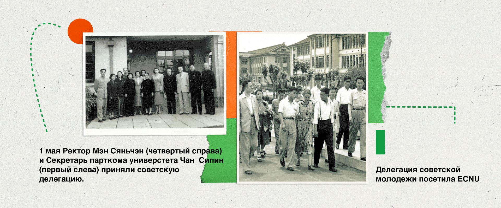 正如丽娃河的名字所示,华东师大的俄苏情缘源远流长。早在1953年华东师大选派徐天芬、倪蕊琴2位教师和唐惕、曹子方、柴华丽3位同学去苏联学习;1954年,列宁格勒师范学院院长、苏联专家杰普莉茨卡娅应聘到校,任教育学教授兼校长顾问;同年,华东师大俄语系成立(1951年建校初期已启动俄语教学);1956年,苏联青年代表团来校访问……一张张珍贵的档案照片,通过今昔时空对比的设计方式,在俄文官网“俄苏情缘”版块呈现。