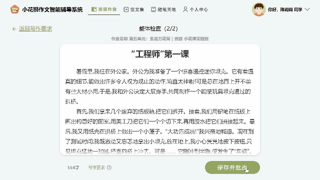 “小花狮”的教师端是一个智能化的教学辅助平台,系统支持教师设置单元习作任务、小组互评任务和合作式写作等教学活动,在系统自动给出智能初评意见后,教师可以进一步通过点选标签、新增评价和语音点评等方式快速地复批作文,还可以查看学生修改历史记录,设置优秀范文和打印在线批改结果等。