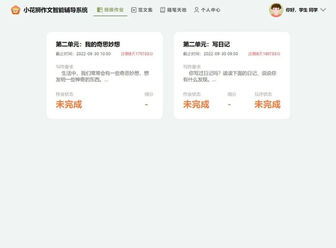 “小花狮”的学生端则是一个智能化的学习测评平台,系统支持学生即时拍照上传作文、智能化自动评阅,进行学伴互评互改、查阅优秀范文和查看学情变化趋势等,帮助学生快速地定位写作错误和难点,在自我修改和相互修改的过程中提高写作能力。