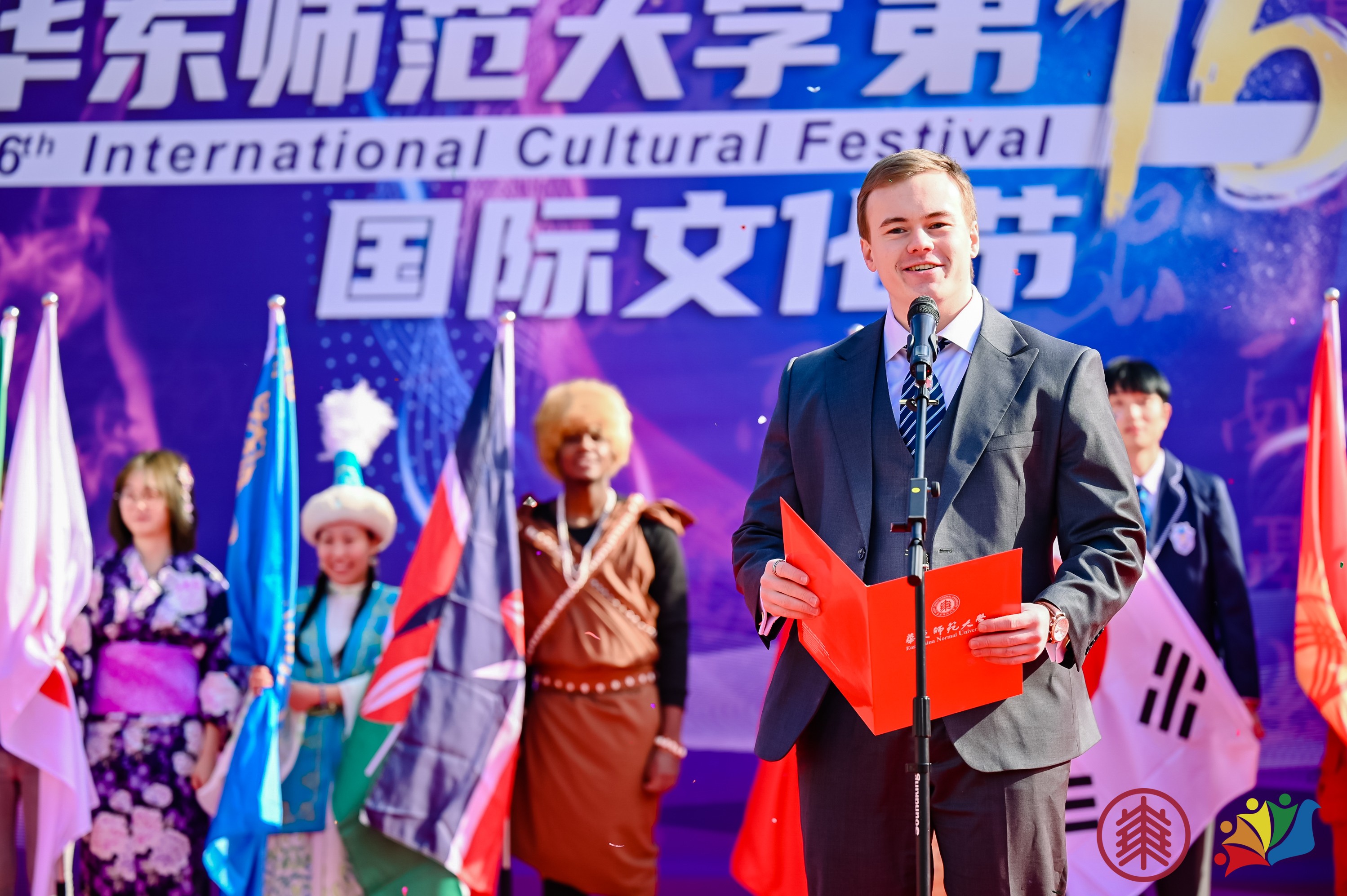 12月11日上午十点,伴随着44个国家的国际学生旗手入场,第十六届国际文化节正式拉开帷幕。华东师大副校长顾红亮在开幕式致辞中表示,今年国际文化节的核心,关键在于一个“融”字,其中包含了大上海保卫战期间,国际学生志愿者参与校园抗疫、与学校并肩作战的“共融之心”,境外国际学生踏上万里归途、回到学校怀抱的“共融之情”,以及国际文化节所彰显的推动各国文化交流互鉴的“共融之美”。他强调,是中外师生携手共同努力才铸就了“留学师大”的卓越品牌。