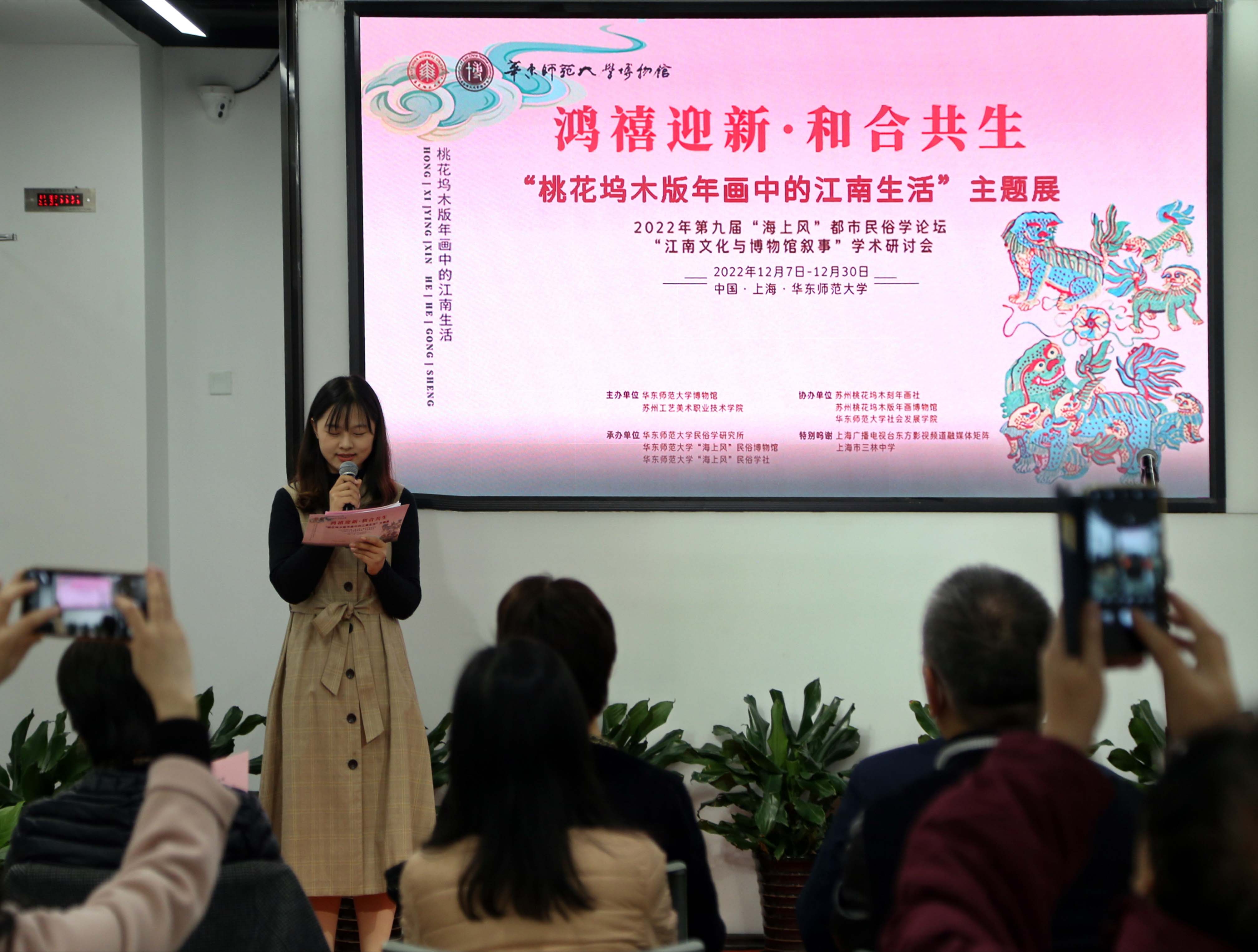 苏州桃花坞木刻年画社社长刘超、传承人申婷,上海明珠美术馆馆长李丹丹,上海东方电视台东方影视频道主任陈曦,上海筷箸文化促进会会长徐华龙,华东师大博物馆常务副馆长夏祥伟、社会发展学院党委书记熊琼、非物质文化遗产传承与应用研究中心主任田兆元、民俗学研究所所长徐赣丽等参加开幕仪式。社会发展学院民俗学2021级博士研究生谢圣心主持开幕式。