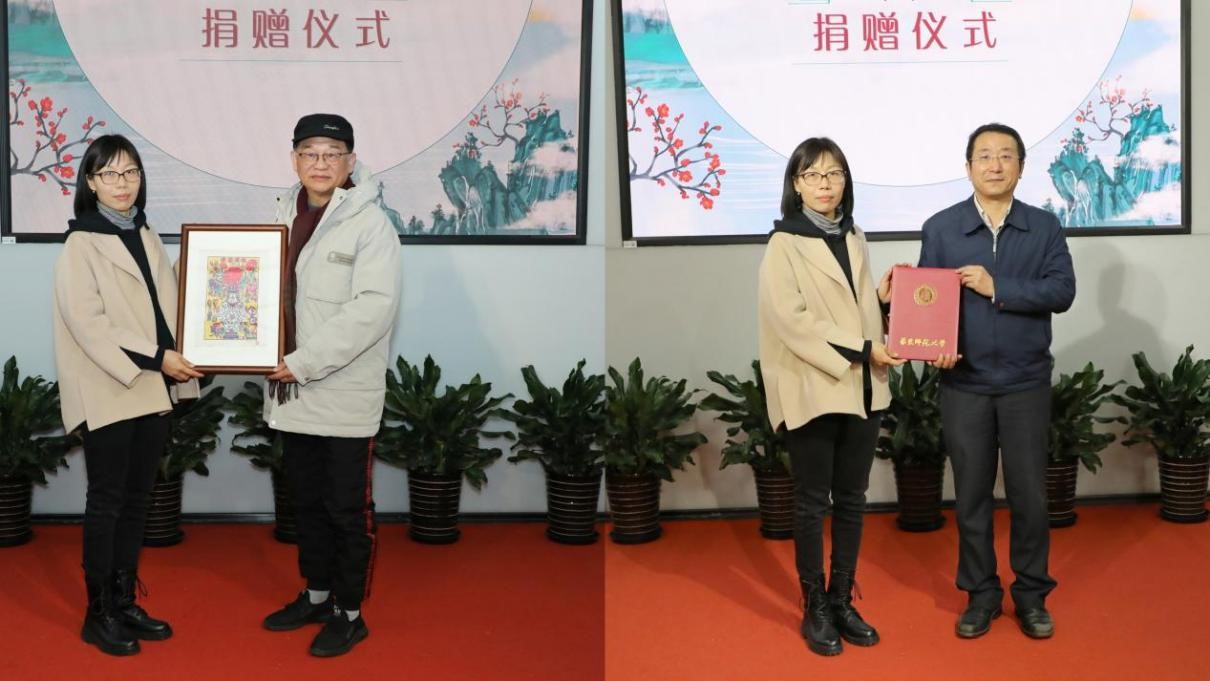 田兆元代表“海上风”民俗博物馆接过申婷手中的桃花坞木板年画作品《花开富贵》,以此为代表接受桃花坞木刻年画社所捐69幅珍贵年画作品;夏祥伟为苏州桃花坞木刻年画社代表申婷颁发捐赠证书。