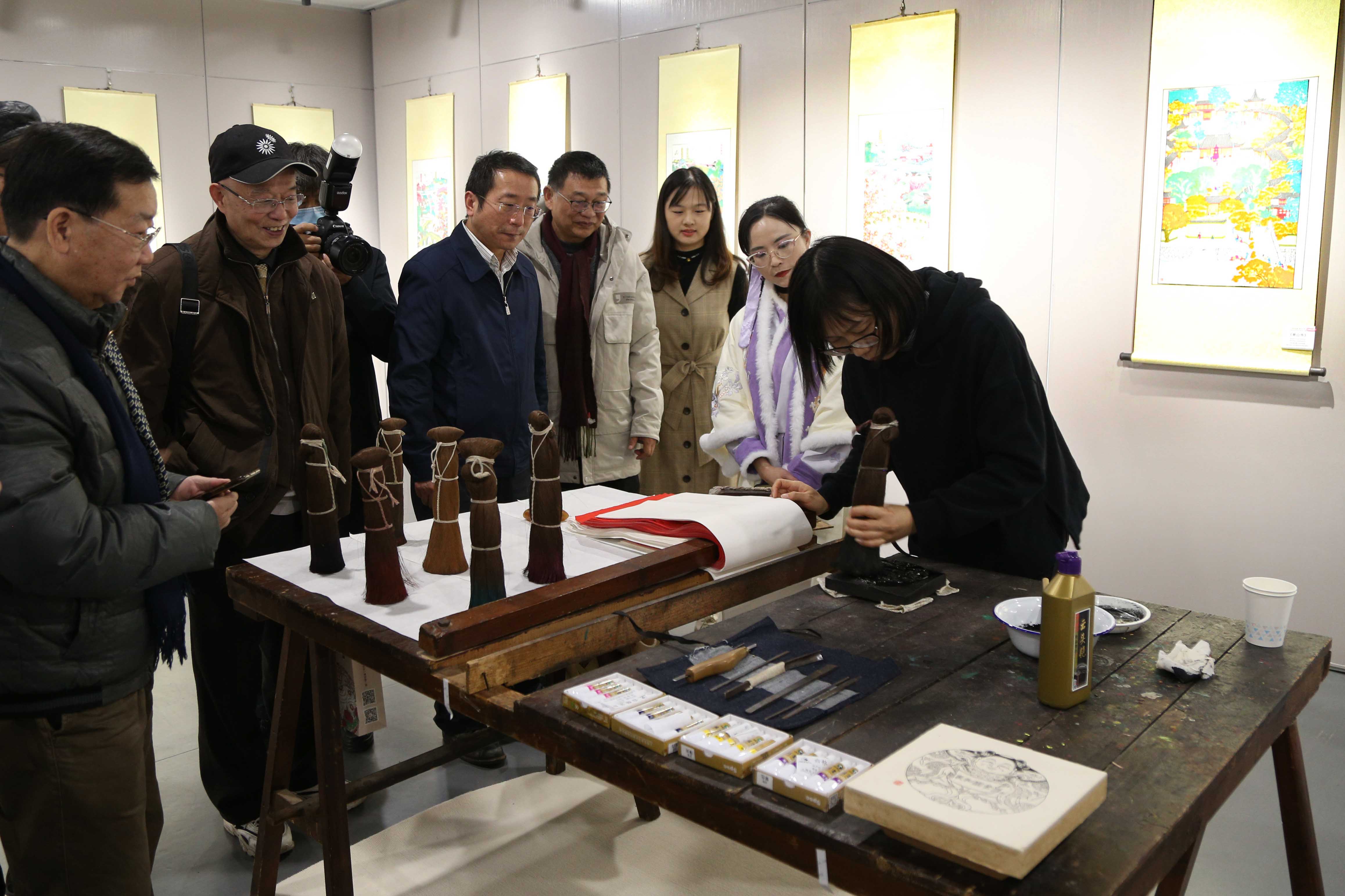 与会嘉宾和师生共同观看了展览宣传片,并在传承人的指引下,按照展陈理念绕场欣赏所展精美桃花坞木版年画作品。嘉宾和师生们感受到的不仅仅是眼前的一幅幅作品,还有年画传承人们在长期的传承过程中所沉淀下来的坚守和执着。