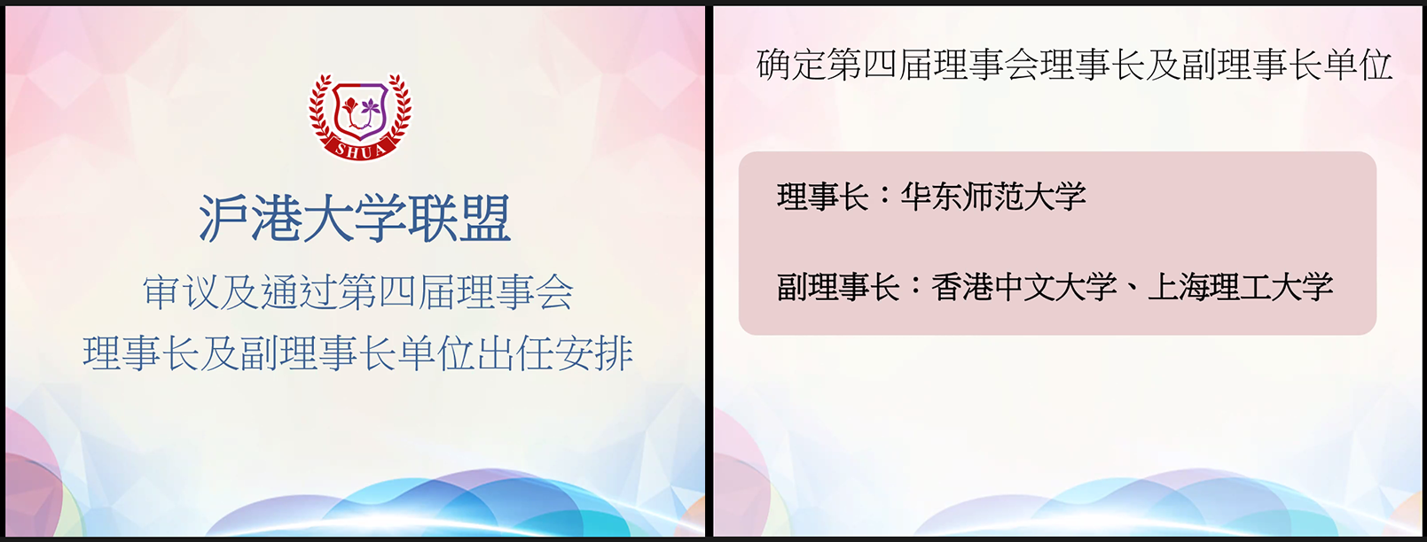 理事会会议上,复旦大学作为联盟秘书处单位,总结报告了含暑期学校、实习项目、财务状况等在内的2022年沪港大学联盟整体工作情况,并对联盟高校间即将开展的“学术成果奖”“交流合作奖”的评定进行方案介绍。随后,全体沪港联盟成员审议并通过了第四届沪港联盟理事会理事长及副理事长单位出任安排,一致同意第四届理事会理事长单位由beat365正版唯一官网担任,副理事长单位由香港中文大学、上海理工大学担任。