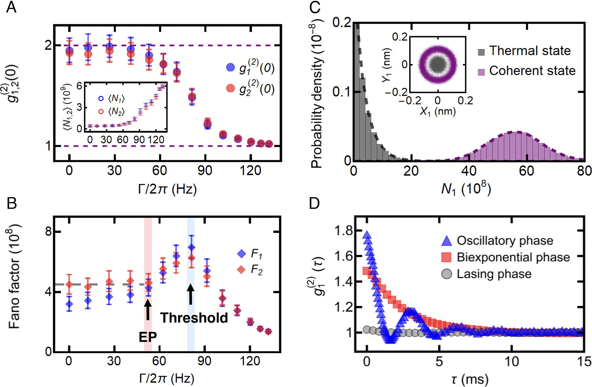 该系统表现出非厄米特性,可研究反宇称时间对称(PT)破坏现象。通过增加耗散耦合强度,耦合系统特征值的虚部在通过奇异点(EP)后分叉。当其中一个杂交模式超过激光阈值,两个机械振子同时进入声子激光态。EP和声子激光阈值可以清楚地观察到并精确调控。强耗散耦合系统的特征表现为能级吸引和阻尼排斥,这与相干耦合的能级排斥正好相反。通过测量二阶声子相关函数可以精确区分不同的相,分别表现出在EP之前的振荡行为、EP和激光阈值之间双指数函数以及阈值之后的相干特性。我们还证明,精确调控机械振子的衰减对于观察能级吸引和反PT对称性至关重要。实验结果为研究非厄米系统中的多模声子激光提供了一条新途径,表明耗散可以是控制开放复杂系统中相互作用的有用资源。