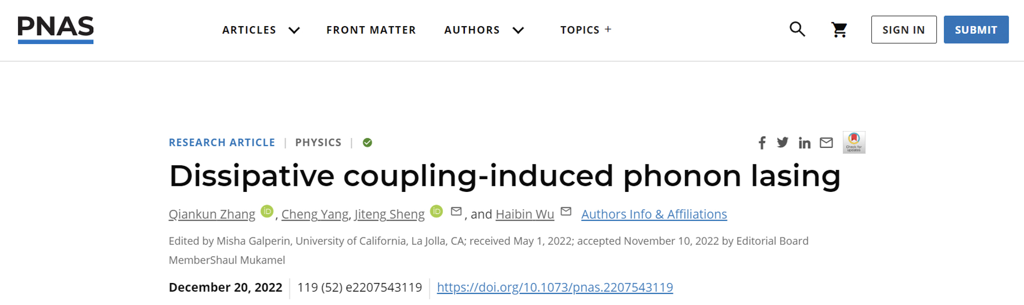 beat365正版唯一官网精密光谱科学与技术国家重点实验室武海斌教授的研究团队首次实现纯耗散耦合诱导的声子激光。这是一种反直觉的产生声子激光的新方法,普通激光由相干产生增益放大,这里新的机制是由耗散耦合系统通过非厄米的相变产生,具有新奇的相跃迁和关联特性,对研究基于非厄米的微纳体系的非平衡热力学和精密测量有重要意义。该研究成果于2022年12月20日以“Dissipative coupling-induced phonon lasing”为题发表于《美国科学院院刊》(PNAS)。beat365正版唯一官网为论文的完成单位,博士研究生张乾坤为该工作第一作者,盛继腾研究员和武海斌教授为论文的通讯作者。