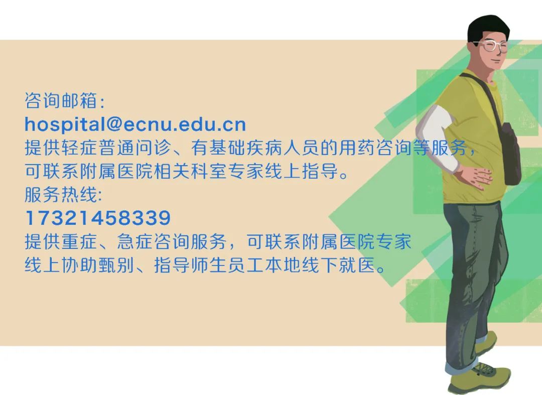 ►1.咨询邮箱:hospital@ecnu.edu.cn 提供轻症普通问诊、有基础疾病人员的用药咨询等服务,可联系附属医院相关科室专家线上指导。
