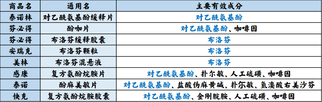 需要注意的是一些治疗感冒的药品除了含有对乙酰氨基酚、布洛芬外,还含有抗过敏减轻鼻黏膜水肿(流涕)成分氯苯那敏、伪麻黄碱,控制干咳成分右美沙芬可供搭配。