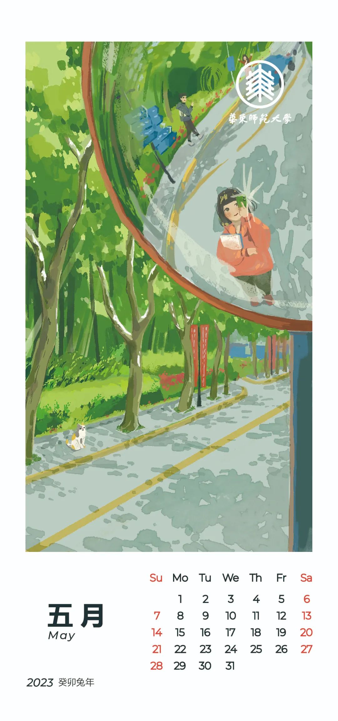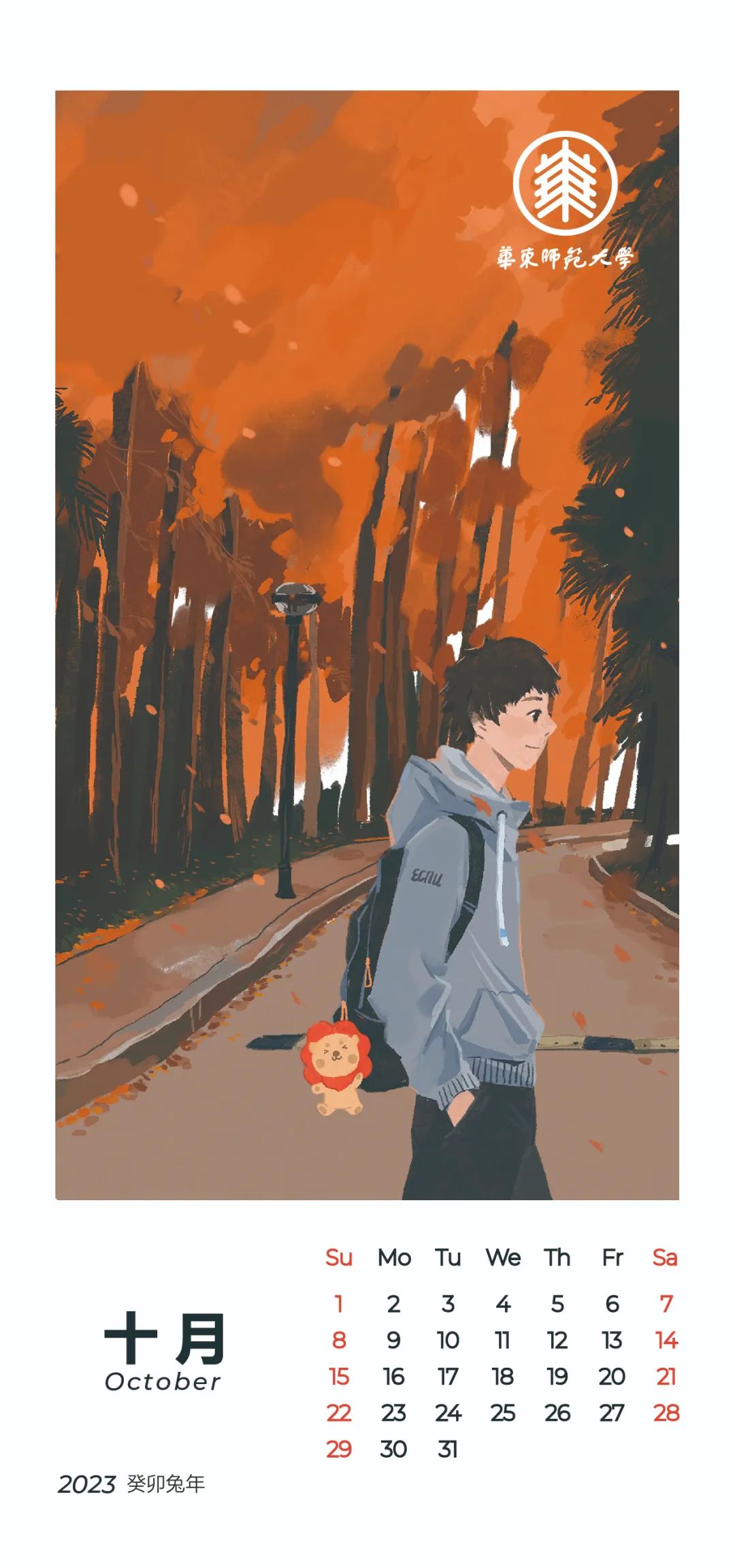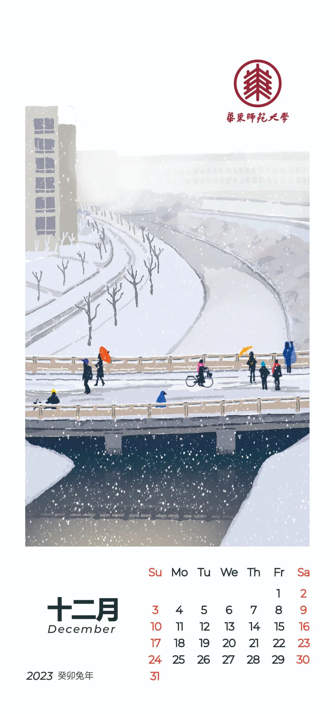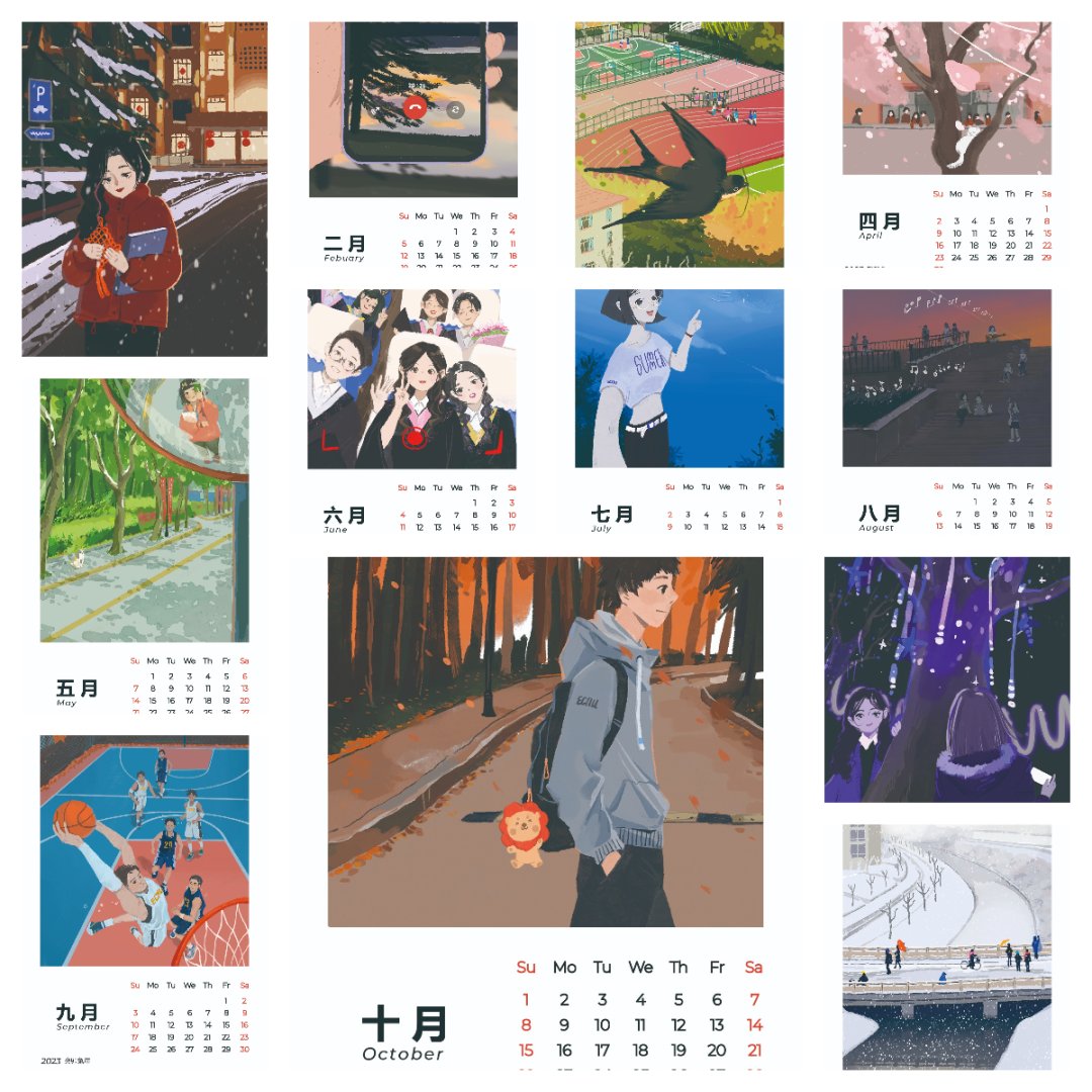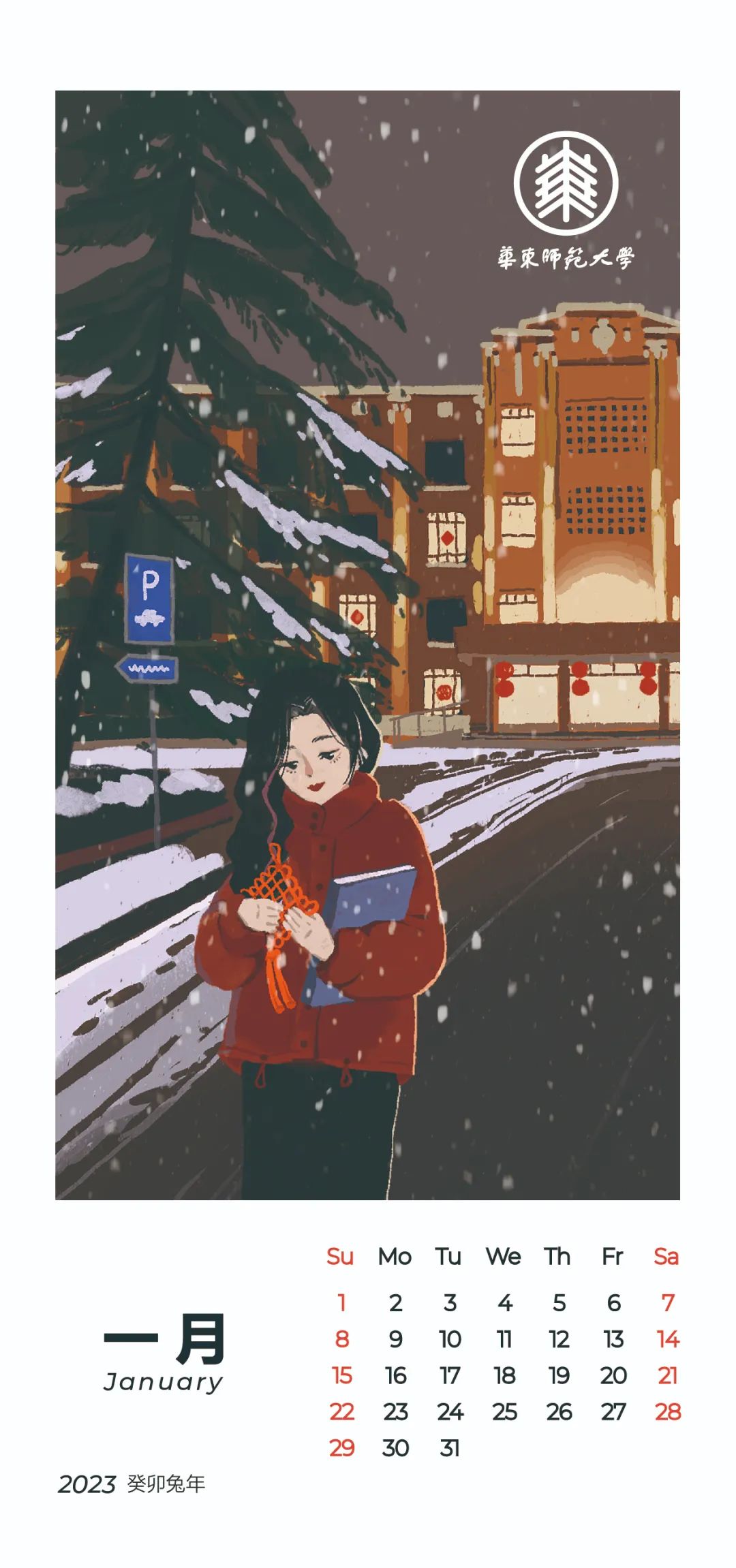 “创作月历系列插画的初心,来自疫情之下对美好校园生活的怀念和对新一年生活的祝福。”龙一甜这样说。月历中描绘的12个月风貌,是大家所熟悉的校园四时景象:浪漫的樱花教室、金黄的水杉路、法国梧桐上缠绕的彩灯、樱桃河上的瑞雪;是在校园中感受到的转瞬心境:浓浓的年味、莲池悄悄地发生着夏日的小美好、盛夏的晚风、年轻又活泼的血液……创作时由于种种原因未能再次回到华东师大校园,只能在记忆的角落里搜集出四时的回忆和当时的感动,并努力把它们画在画面里,聊寄思念。