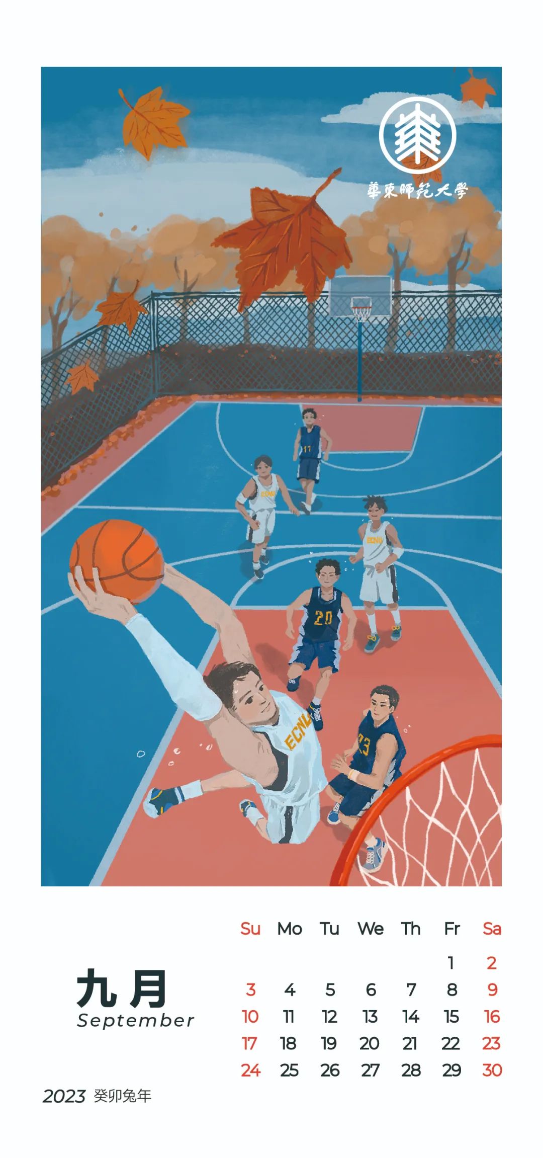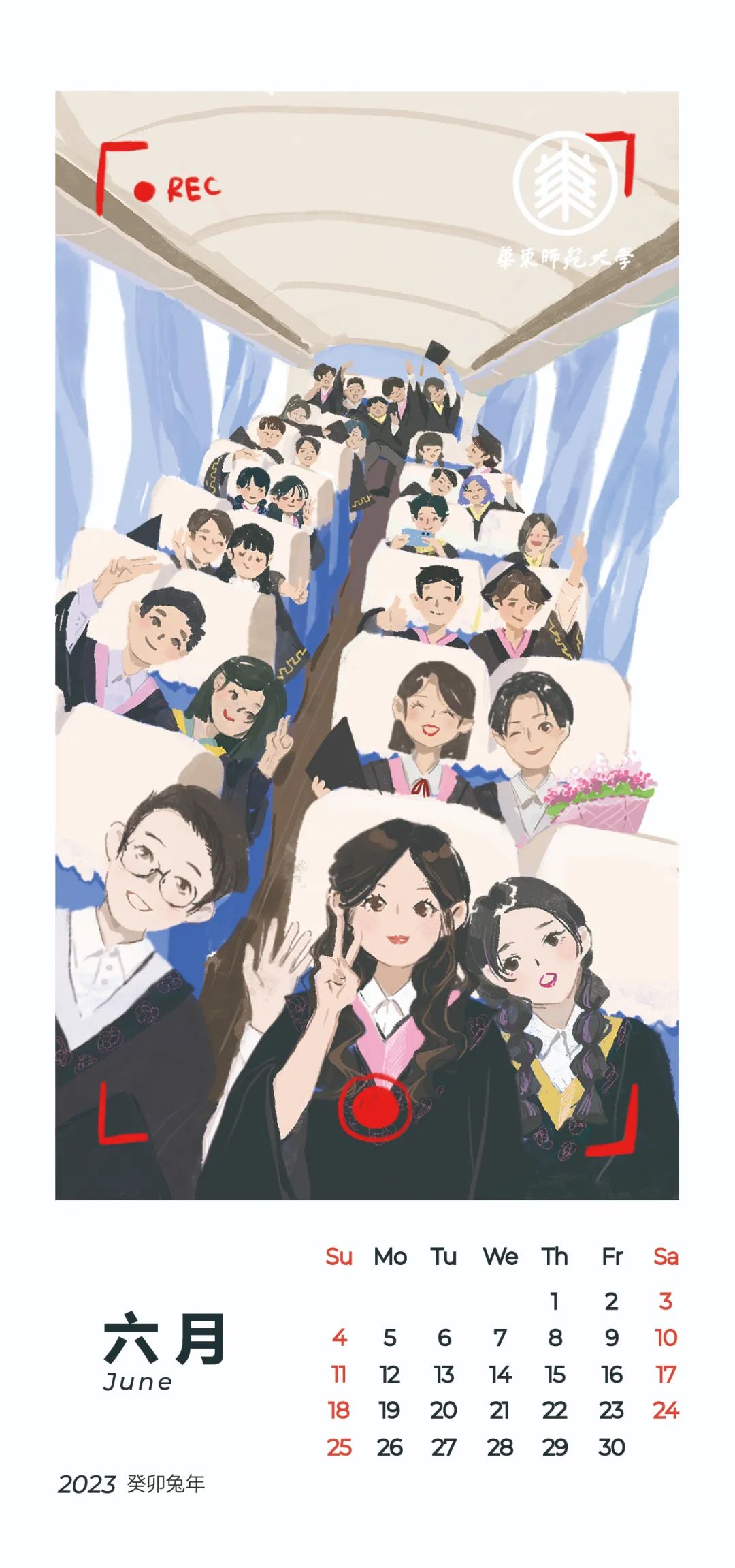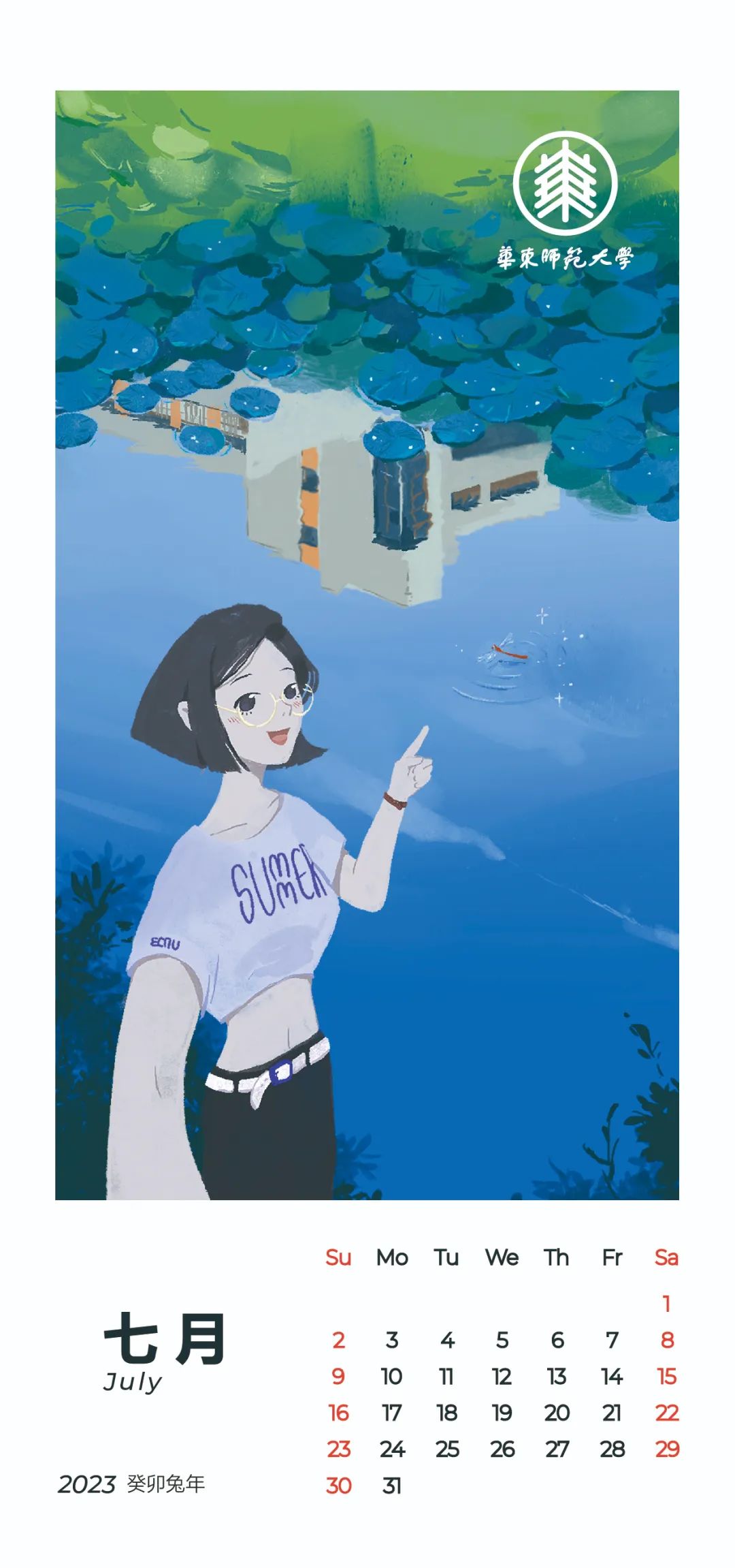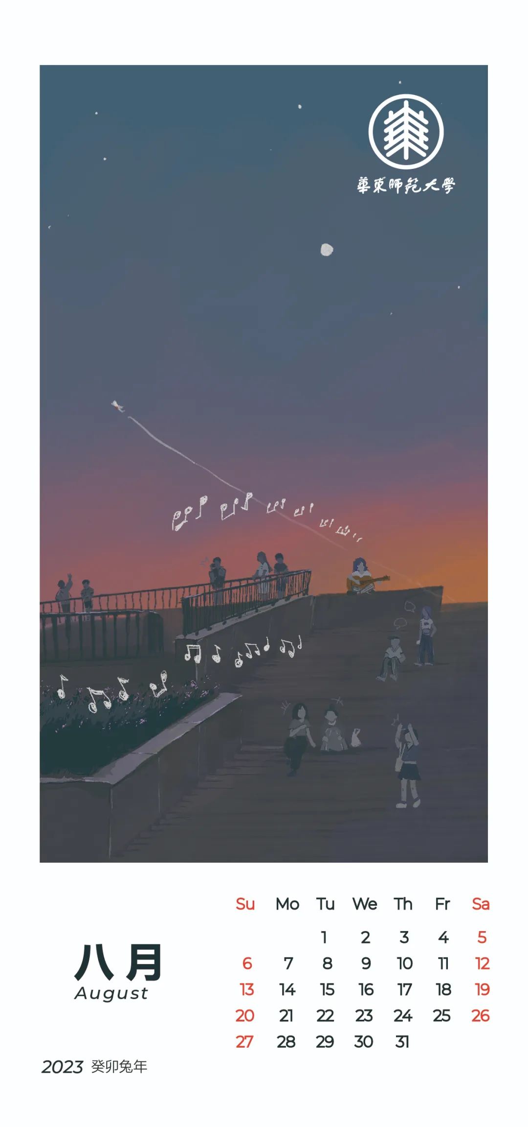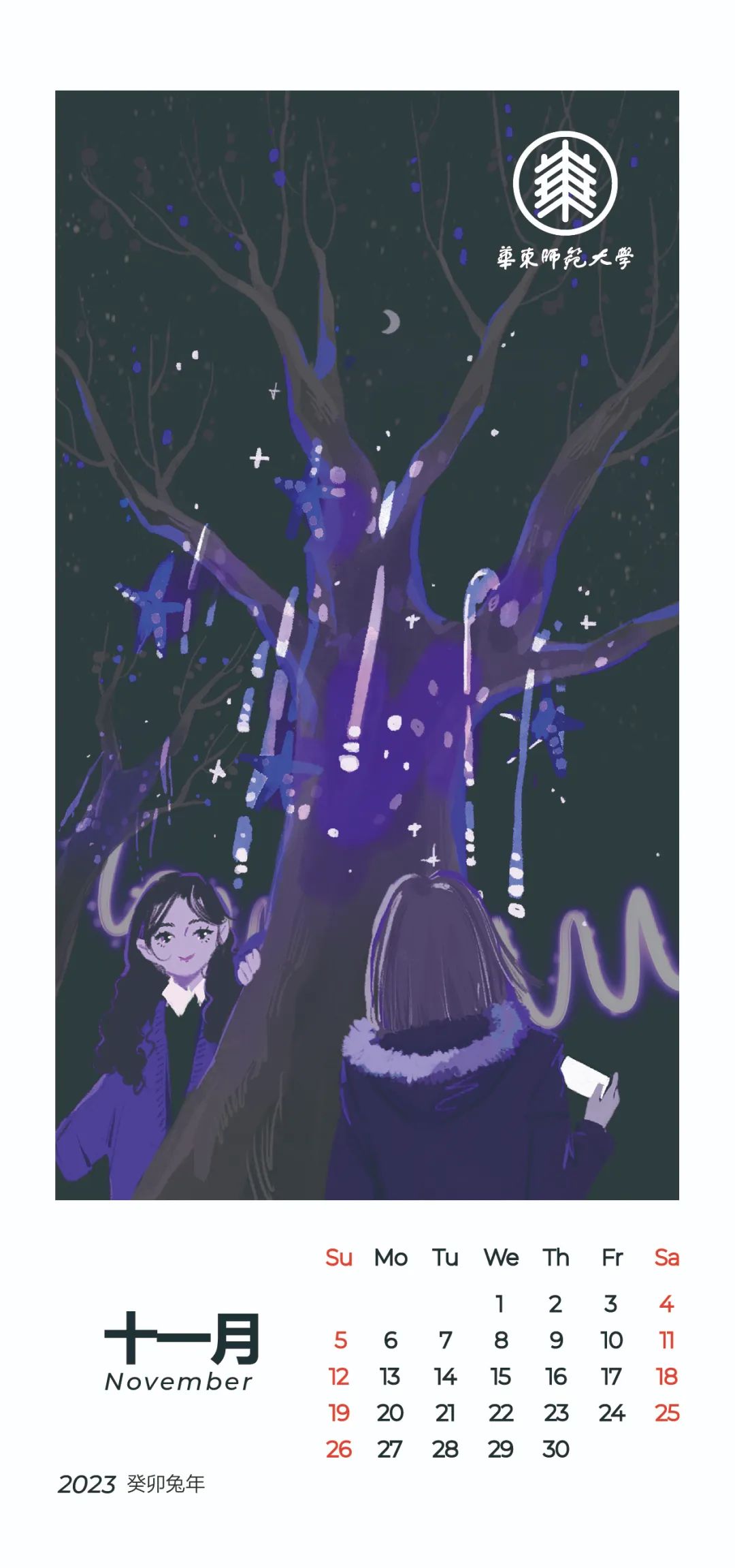 “创作月历系列插画的初心,来自疫情之下对美好校园生活的怀念和对新一年生活的祝福。”龙一甜这样说。月历中描绘的12个月风貌,是大家所熟悉的校园四时景象:浪漫的樱花教室、金黄的水杉路、法国梧桐上缠绕的彩灯、樱桃河上的瑞雪;是在校园中感受到的转瞬心境:浓浓的年味、莲池悄悄地发生着夏日的小美好、盛夏的晚风、年轻又活泼的血液……创作时由于种种原因未能再次回到华东师大校园,只能在记忆的角落里搜集出四时的回忆和当时的感动,并努力把它们画在画面里,聊寄思念。