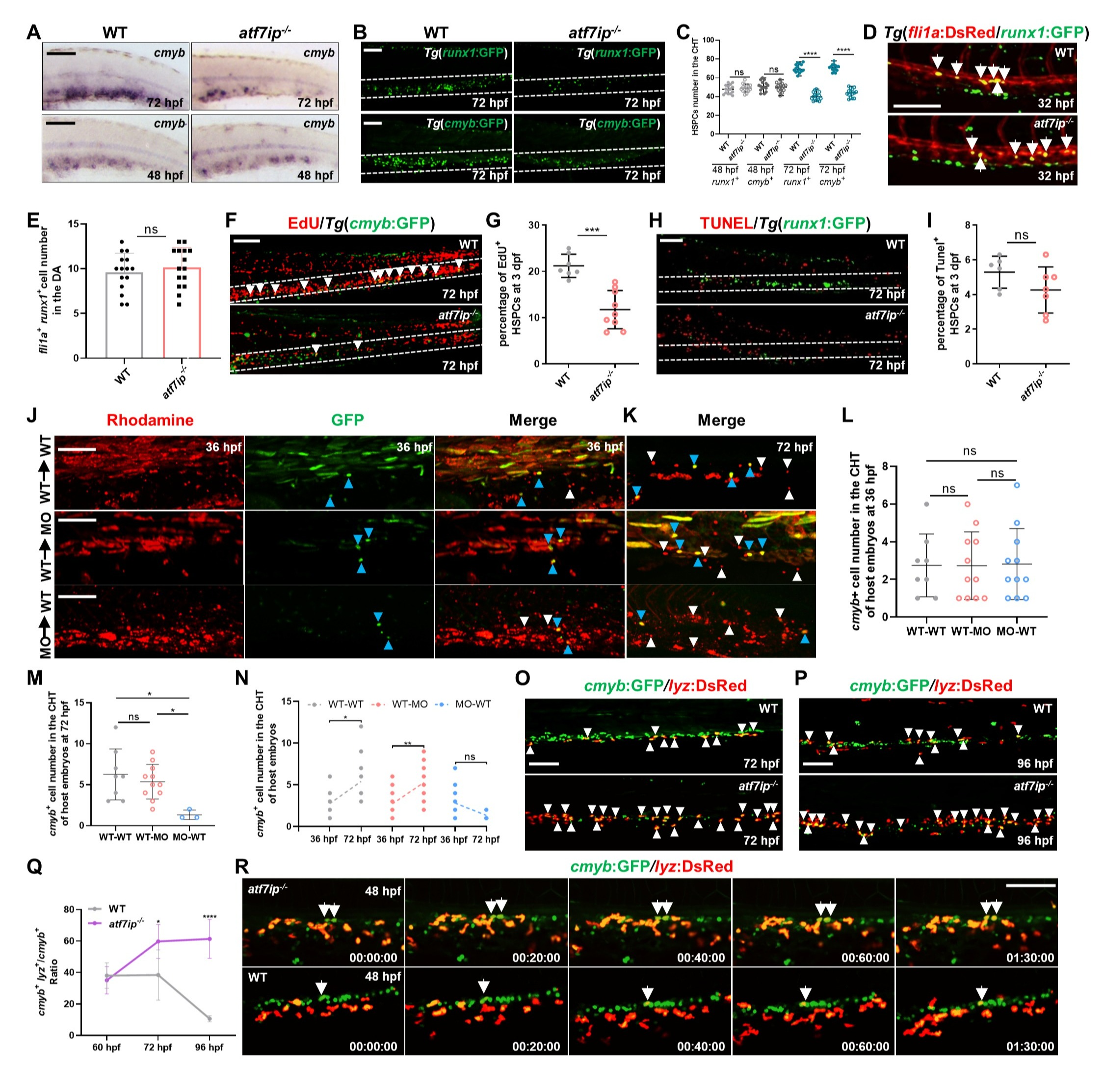造血干细胞(Hematopoietic and progenitor cells,HSPCs)是一群具有增殖、分化和重建能力的异质性干祖细胞。造血干细胞的多样性分化对于维持外周血稳态与功能至关重要,多种血细胞分化平衡的破坏会导致贫血或恶性血液疾病。在血液形成过程中,造血干细胞是从主动脉-性腺-中肾区(Aorta-Gonad-Mesoneph,AGM)动脉腹侧生血内皮中产生,随后迁移至哺乳动物的胎肝(Feter Liver)或斑马鱼的尾部造血组织(Caudal Hematopoietic Tissue)进行快速增殖和分化,最终定植于骨髓或肾脏,维持成体造血。造血干细胞的扩增与分化受到内源性因子和周围微环境的综合调控。在稳态或应激条件下,造血干细胞如何协调其造血干性与多种血细胞分化一直是生物医学研究领域中的一个基本科学问题,相关细胞分子机制及关键因子还知之甚少。