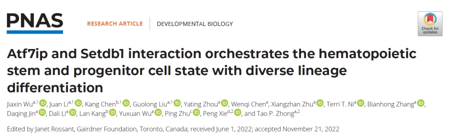 2022年12月28日,beat365正版唯一官网生命科学学院钟涛教授团队在国际知名期刊 PNAS 上,在线发表题了"Atf7ip and Setdb1 interaction orchestrates the hematopoietic stem and progenitor cell state with diverse lineage differentiation" 的研究论文。该工作应用发育生物学、表观遗传学及基因组学方法揭示了 ATF7IP/SETDB1 介导的组蛋白甲基化修饰是协调 HSPC 干细胞状态与多种血液谱系分化的一个关键检测点(CHECKPOINT),用于维持红系、髓系和淋巴系等多种细胞的平衡分化及血液系统的正常循环与功能。