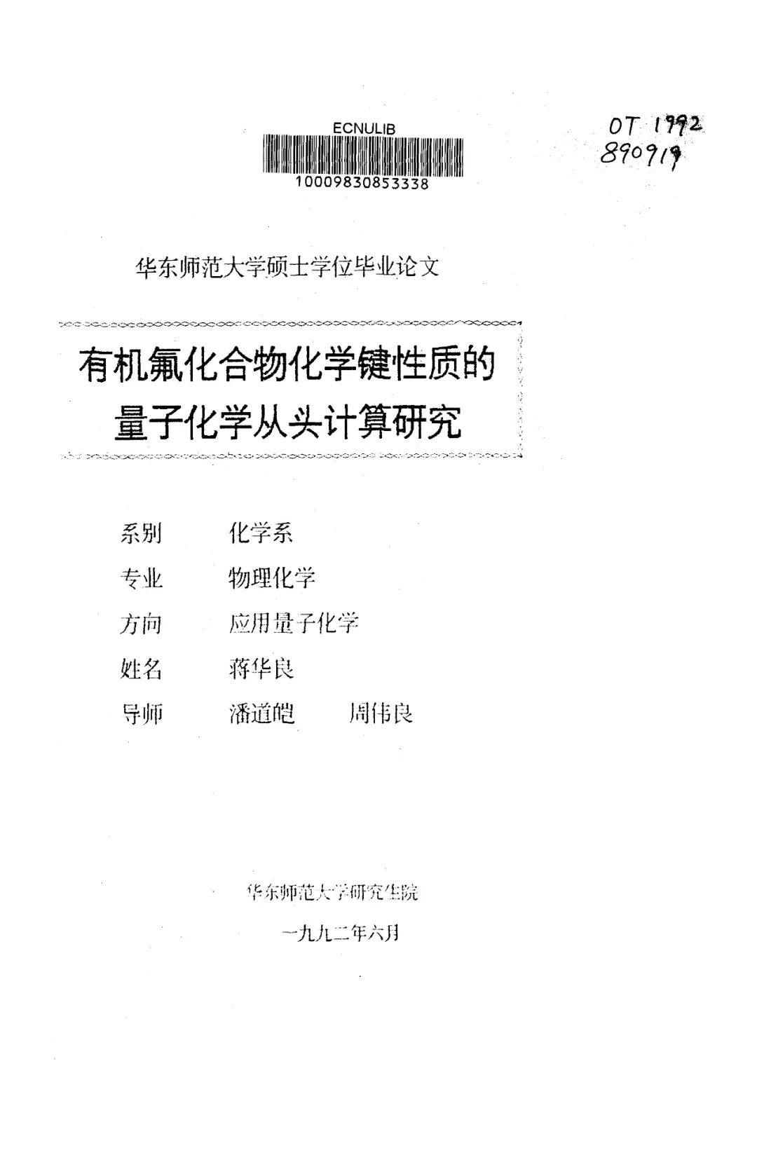 硕士毕业论文以“有机氟化合物化学键性质的量子化学从头计算研究”为题,1992年获得学校研究生学术成果奖,论文成果发表在《化学学报》