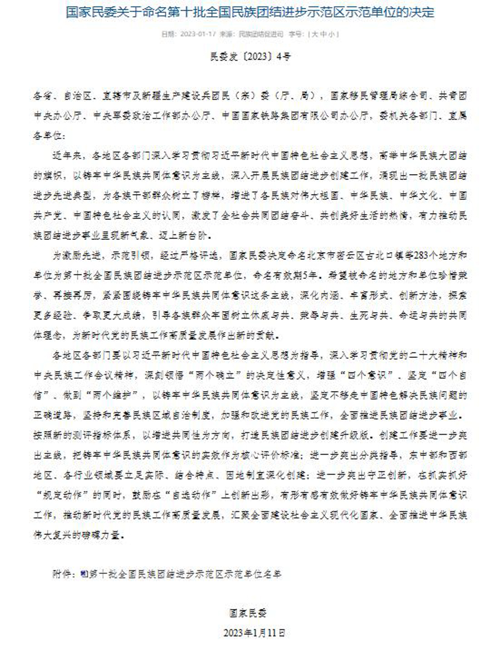 国家民委关于命名第十批全国民族团结进步示范区示范单位的决定