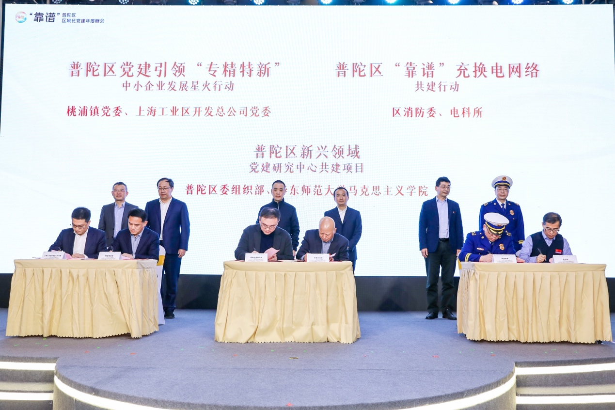 在此次“靠谱”大会上,还举办了2023年重点区域化党建项目集中签约仪式,其中一项为华东师大马克思主义学院与普陀区委组织部签署的普陀区新兴领域党建研究中心共建项目,旨在建立华普“两新”党建研究中心,打造“苏河育才”党务工作者联合培育计划,举办“靠谱”区域化党建联盟新时代党建研修班,建立党建项目联合攻关机制。华东师大马克思主义学院赵正桥书记与普陀区委组织部副部长卢礼卿代表双方签署了合作协议。