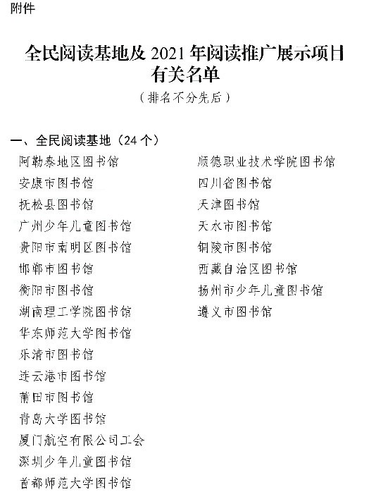 2023年2月,中国图书馆学会下发了《关于公布2021年全民阅读工作有关名单的通知》(中图学字〔2023〕8 号),公布了全国24个单位获评“全民阅读基地”,全国37个项目获评“2021年阅读展示项目”,华东师大图书馆获评“全民阅读基地”。