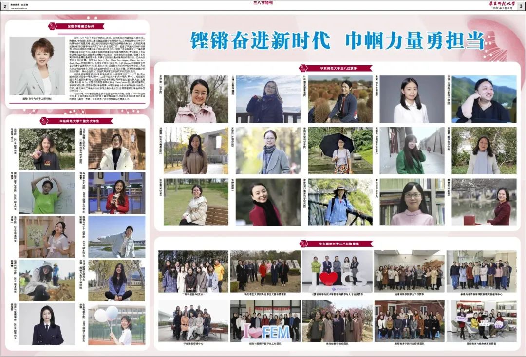 在强国时代,师大女性铿锵绽放。党的二十大召开后,教育强国建设的时代召唤为女性教育科技工作者和女大学生的成长发展提供了新的历史机遇和广阔的施展舞台。“国之所需、吾之所向。”在华东师大,有在脑成像领域做出系统、创新性研究的全国巾帼建功标兵获得者;有聚焦人口热点议题,助力人才强国建设的全国政协委员;有在本科阶段接连发现新物种,发表研究型论文17篇,SCI一作6篇的科研宝藏女孩;有放弃大厂高薪,圆梦航天八院的“追星”达人;还有在第五届中国国际进口博览会上展现青春风采的ECNU“小叶子”们……感谢时代舞台上奋力起舞的每一位师大女性,凭借“敢想”的勇气、“善谋”的本领、“实干”的姿态,成为华东师大的底气、骄傲和亮色。