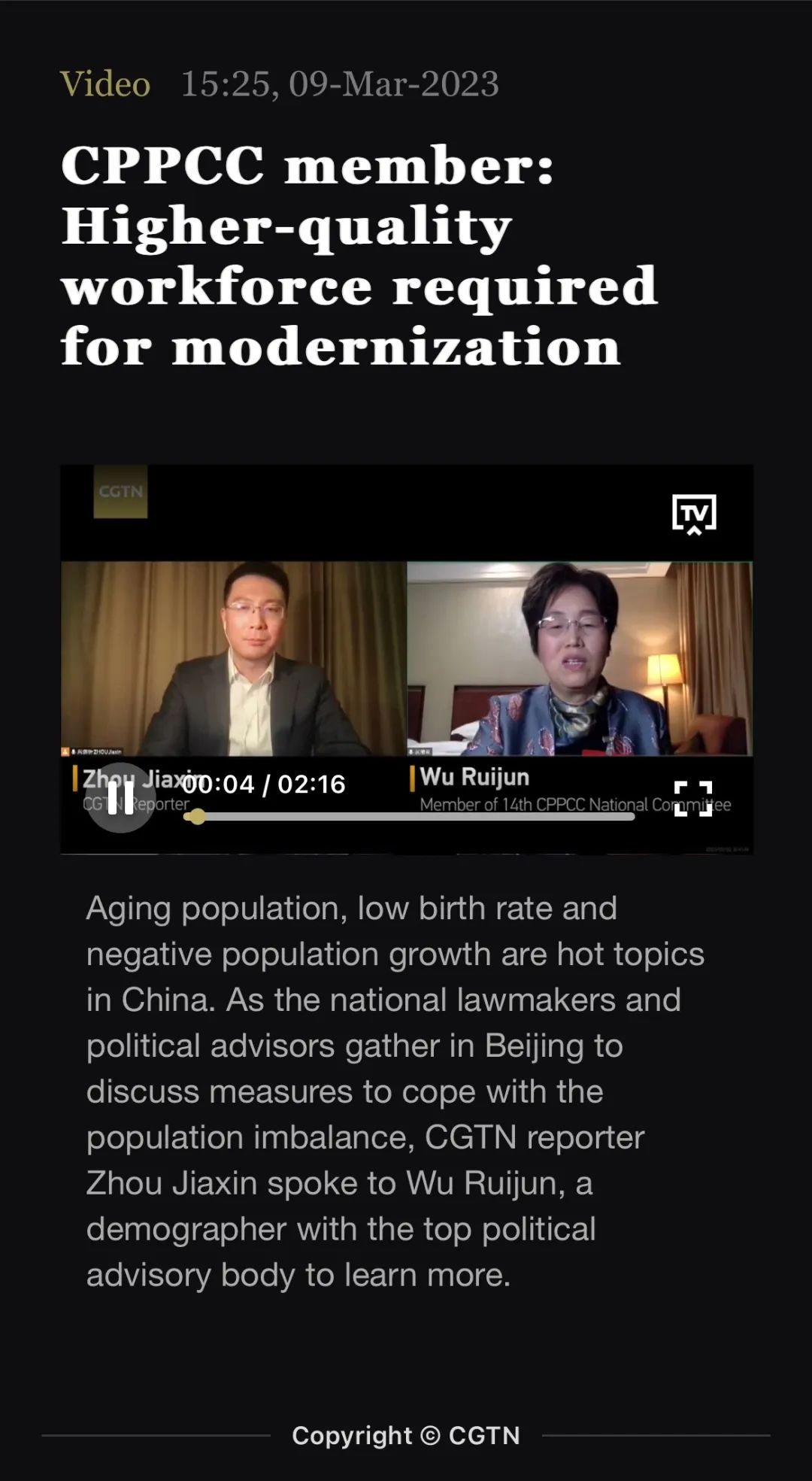 CGTN中国国际电视台丨CPPCC member: Higher-quality workforce required for modernization